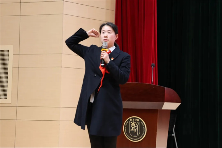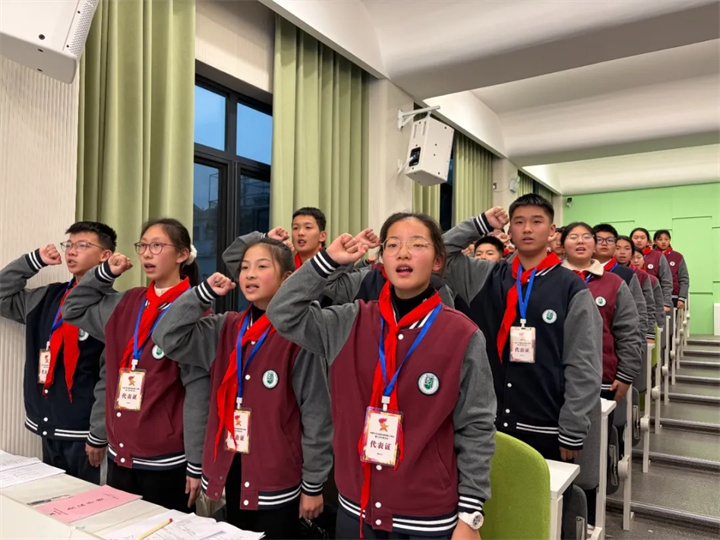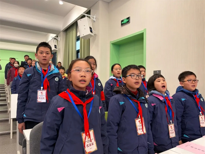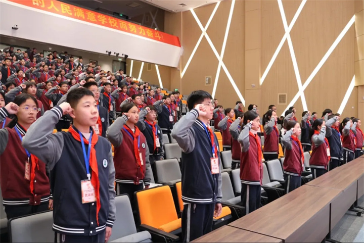 “准备着,为共产主义事业而奋斗!”“时刻准备着!”激昂的呼号声在校园上空久久回荡。大会最后,团委副书记张静静老师带领全体少先队员庄严宣誓、呼号,鲜红的红领巾映照着孩子们坚定的脸庞,铿锵的誓言表达了新时代少先队员听党话、跟党走的坚定决心和为实现中华民族伟大复兴而努力奋斗的远大志向。全体与会人员齐唱校歌,歌声嘹亮、催人奋进,第七次少先队代表大会在庄重热烈的氛围中圆满闭幕。