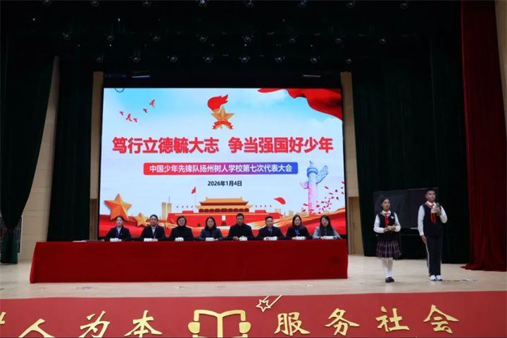 冬日暖阳映照校园,鲜红队旗迎风招展。为深入学习贯彻习近平总书记关于少年儿童和少先队工作的重要论述及指示精神,全面落实新时代少先队改革要求、中国少年先锋队第九次全国代表大会精神,进一步强化少先队组织建设,规范少先队工作体系,引导广大少先队员树立民主参与意识、厚植主人翁责任感,1月4日下午,树人学校以“笃行立德毓大志 争当强国好少年”为主题的第七次少先队代表大会隆重召开。