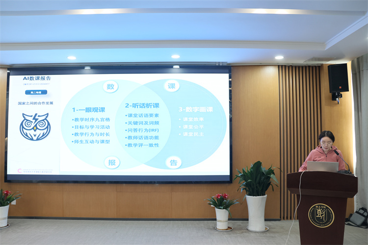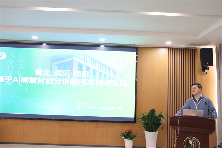 在评课环节,陈华琪老师以《看见·洞见·预见》为题,系统展示了我校基于AI课堂智能分析系统的精准评课实践。依托AIC系统生成的教学数课报告,从教师提问数量与类型、师生对话轮次与质量、话语功能分布、教学环节时间轴等多维指标入手,对马珊老师的课堂进行全景画像。数据显示,本节课推理性问题占比突出,思维含量充足;同时,建议适当增加开放性问题的比例、优化发言机会的均衡性。“数据不是评判教师的标尺,而是导航教学改进的罗盘。”陈老师的分享引发了在场教师对“用数据读懂课堂”的深度共鸣。