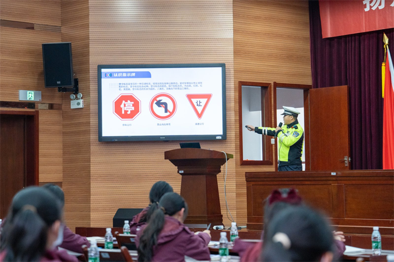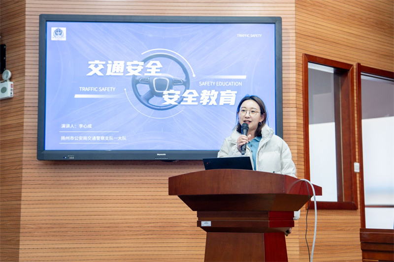 扬州市公安交警支队一大队交警面对面向在坐同学们讲解交通安全常识,并结合典型交通事故案例,分析事故发生原因及引发的后果,深入说明了逆道行驶、闯红灯、不系安全带、骑乘电动车不佩戴安全头盔等交通违法行为的重重危害,提醒同学们牢记交通安全常识,自觉养成良好的交通习惯。交通执法支队的水上交通安全形象大使则以学生们常见的船舶类型为切入点,通过PPT演示、发放手册等通俗易懂的授课方式,深入浅出地向同学们讲解了水上安全的重要性以及水上游船出行的注意事项,并同步传授防溺水、水中遇险报警和自救等基本安全知识。课堂上执法人员还手把手教同学们正确使用救生衣,并现场邀请学生代表上台开展“救生衣穿戴”大比拼,让学生“第一视角”感受救生衣的穿戴方式。上台参赛代表边练边比、踊跃参与,通过比拼成功掌握了救生衣穿戴技巧。