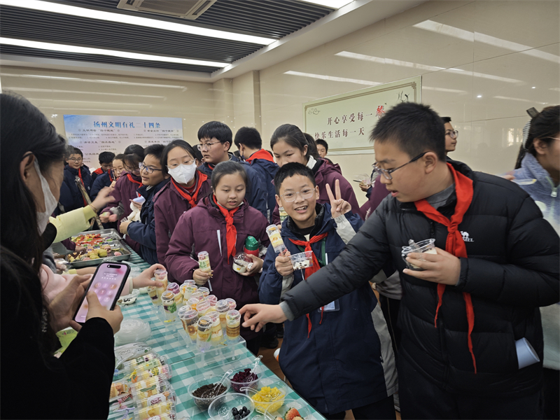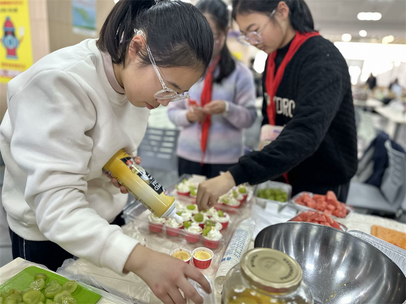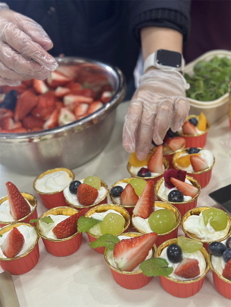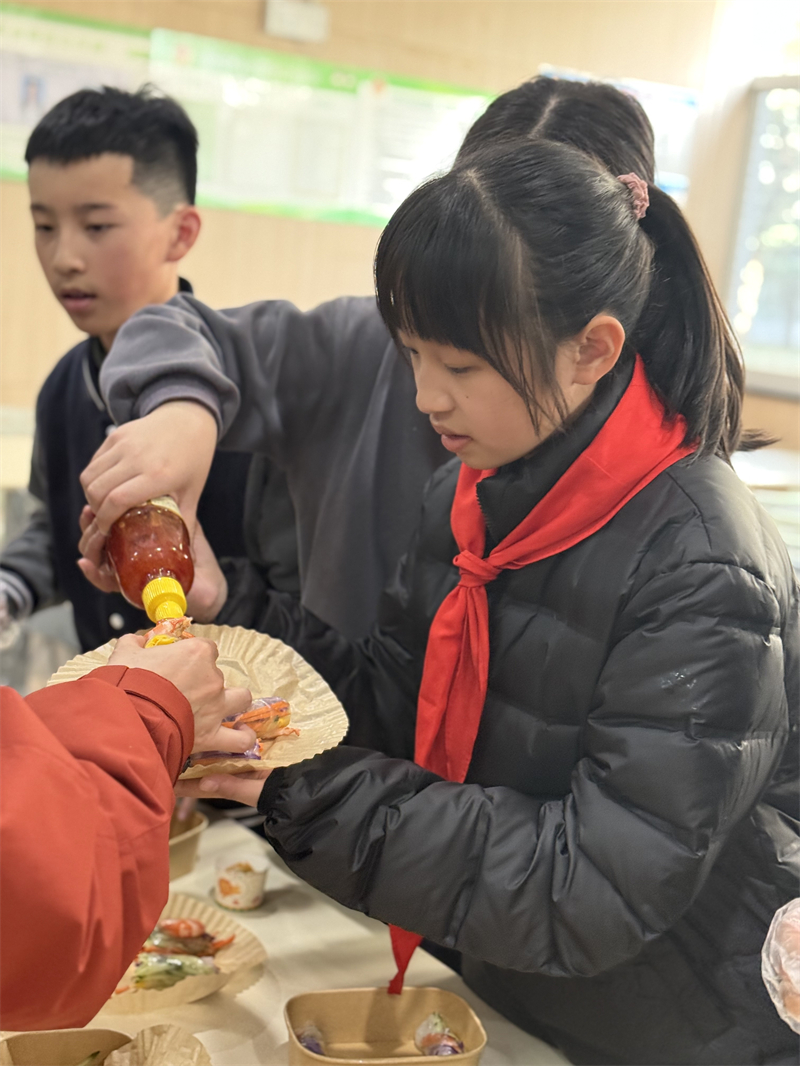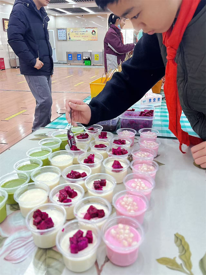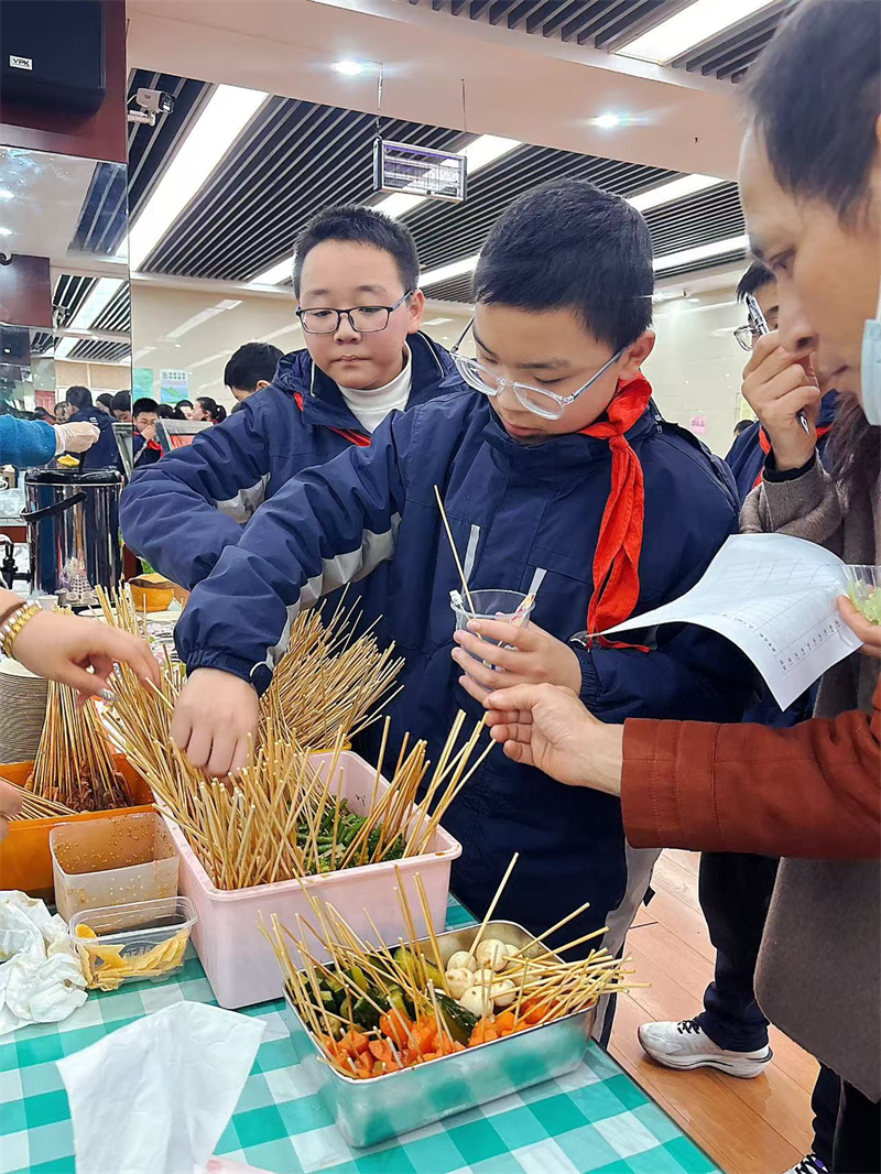 接下来是品鉴环节。同学们分批进入活动场地,开心地品尝各班制作的美食,并进行投票,评委老师也在各组参观品评,最终评选出“人气爆棚奖”、“味冠群雄奖”、“精雕细琢奖”、“创意星厨奖”。