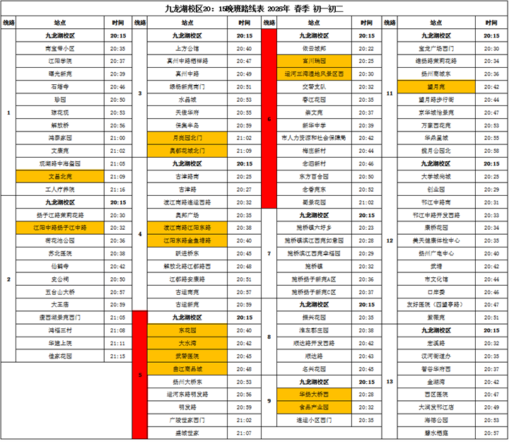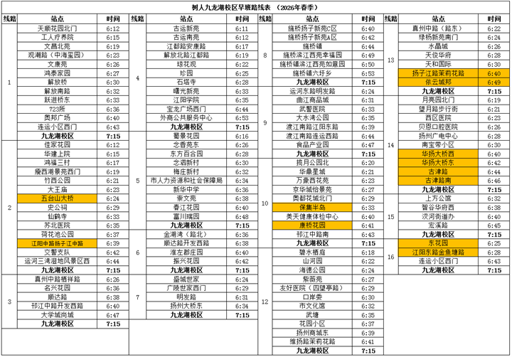【早班线路表】树人学校九龙湖校区2026年春学期定制交通早班路线表