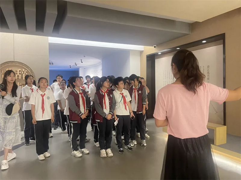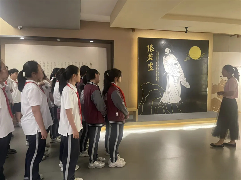 为弘扬中华优秀传统文化,增强学生文化自信,2025年6月26日,扬州树人学校九龙湖校区初二(9)班全体学生在班主任潘老师的带领下,前往位于瓜洲古镇的张若虚纪念馆,开展“诗韵千年·文化传承”主题社会实践活动。此次活动通过实地探访唐代诗人张若虚生平展陈、沉浸式体验《春江花月夜》诗境、参与拓印诗词互动等项目,让同学们深刻感受到古典诗词的永恒魅力。