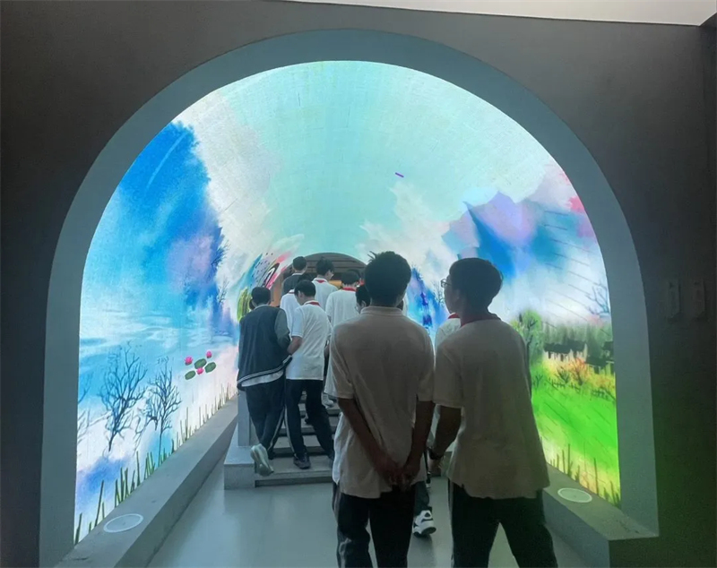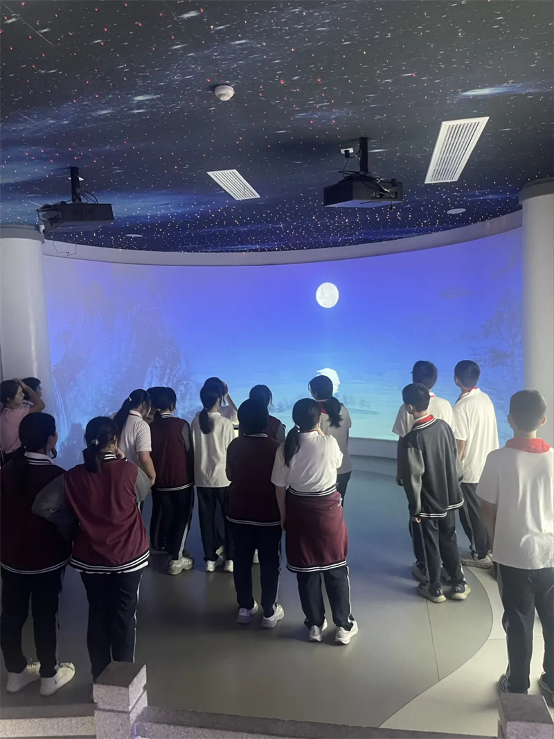 下午4时许,同学们抵达纪念馆。在讲解员的引导下,首先参观了"诗人生平展区"。馆内珍藏的明代刻本《春江花月夜》复原件、清代绘制的瓜洲古渡图卷等珍贵展品,生动再现了这位"孤篇盖全唐"诗人的创作背景。"原来张若虚是扬州本地人,他的诗里'江流宛转绕芳甸'描写的就是我们脚下的这片土地!"学生们在电子沙盘前发出惊叹。在360度全息投影厅,同学们集体诵读了"春江潮水连海平,海上明月共潮生"的千古名句。随着光影变幻,诗句中的江月、花林、沙汀等意象以动态画卷形式铺陈开来,同学们感慨:"这种沉浸式体验让我们真正读懂了诗中'人生代代无穷已,江月年年望相似'的哲学思考。"