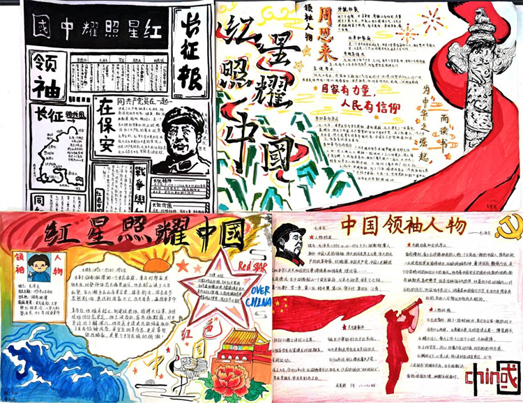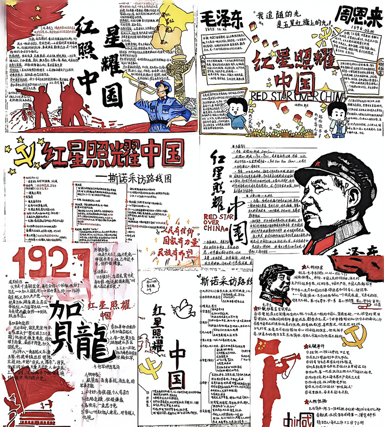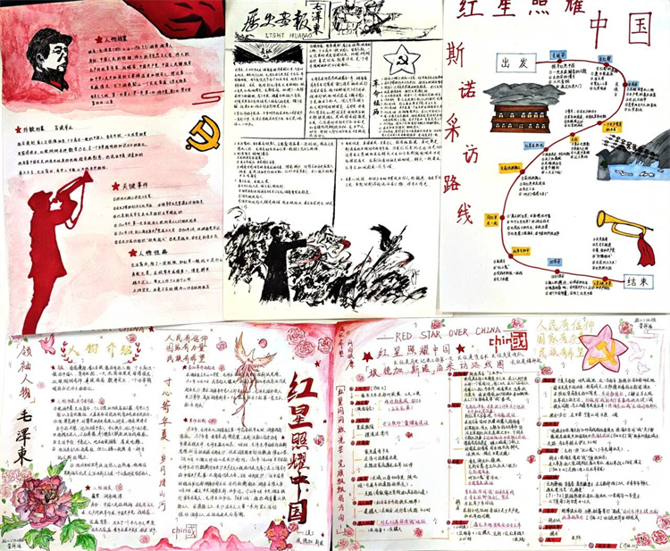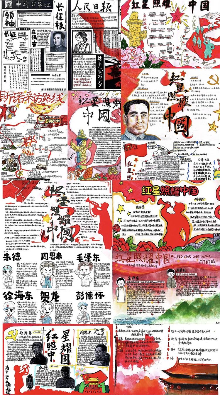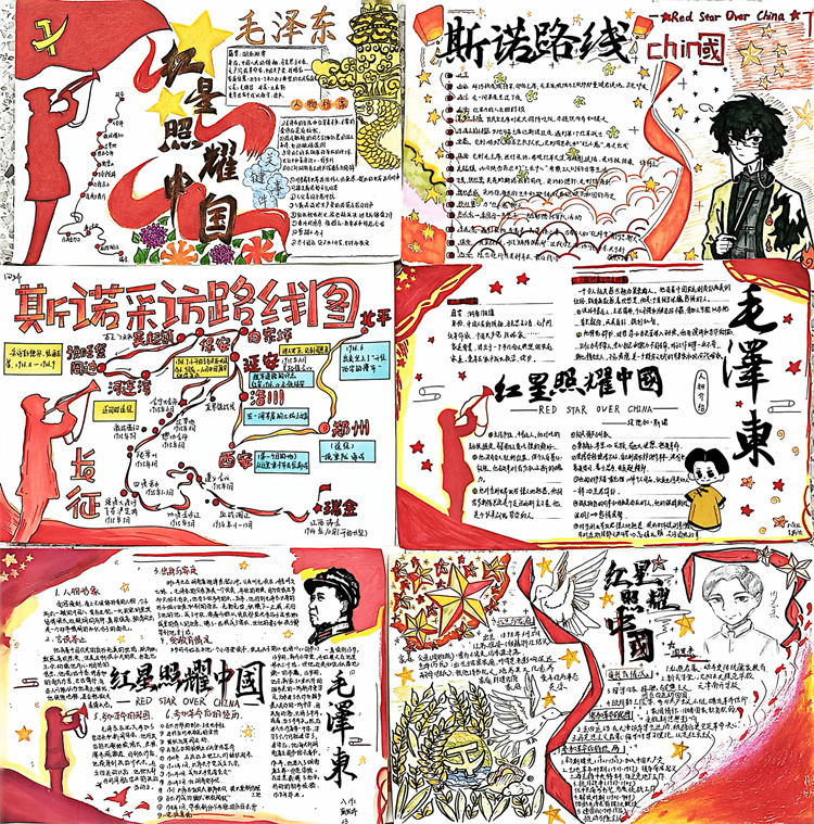 在《红星照耀中国》专题探究中,同学们也展现出丰富的探究成果。手绘的“斯诺拜访路线图”细致还原了1936年斯诺前往陕北的曲折历程,辅以采访札记摘抄,生动再现历史场景;“领袖人物档案”则以图文并茂的形式,立体呈现了毛泽东、周恩来、彭德怀等革命领袖的革命经历与人格魅力。