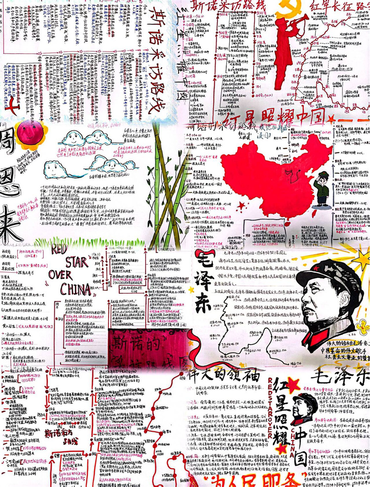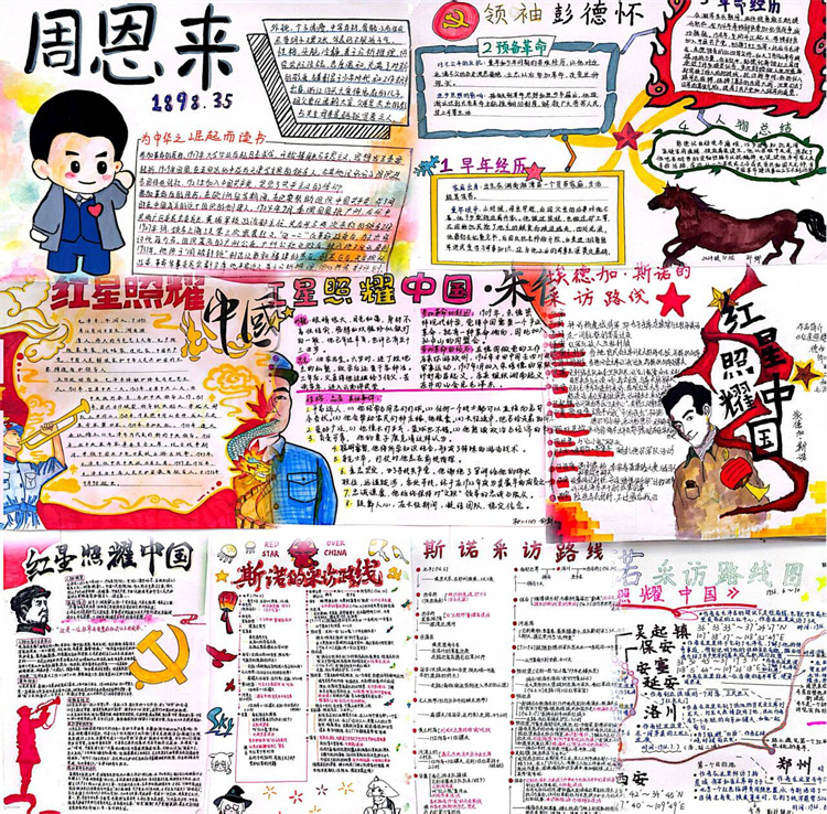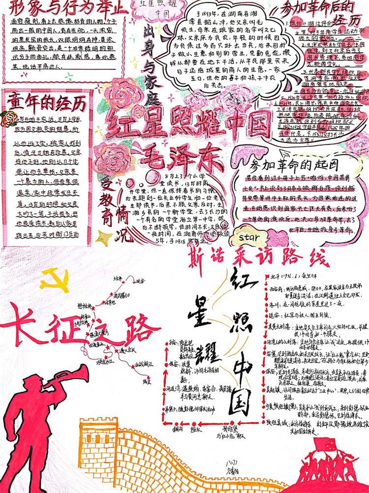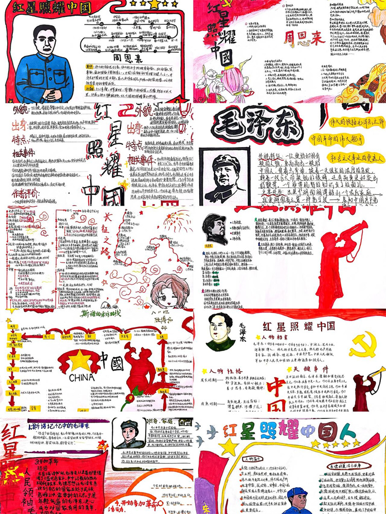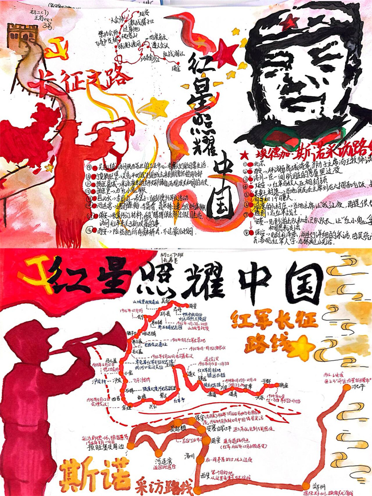 在《红星照耀中国》专题探究中,同学们也展现出丰富的探究成果。手绘的“斯诺拜访路线图”细致还原了1936年斯诺前往陕北的曲折历程,辅以采访札记摘抄,生动再现历史场景;“领袖人物档案”则以图文并茂的形式,立体呈现了毛泽东、周恩来、彭德怀等革命领袖的革命经历与人格魅力。