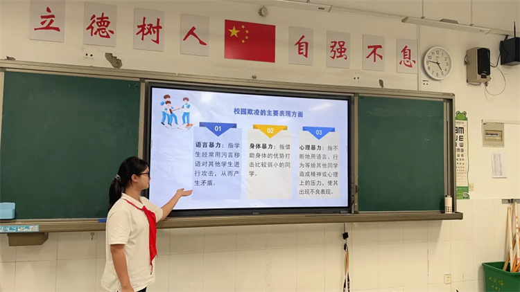在互动环节,学生们围绕“遇到欺凌该如何应对”“看到同学被欺负要不要帮忙”等话题展开讨论,逐渐明晰“不做欺凌者、不做旁观者、做好守护者”的行动方向。不少班级还通过角色扮演,让学生换位思考受害者的处境,进一步增强同理心与责任感,学会用理性沟通、寻求老师帮助等合法方式解决矛盾,共同营造安全、温暖的校园氛围。