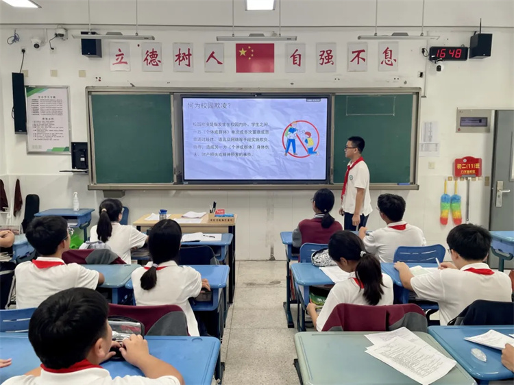 为筑牢学生成长安全防线,引导初中生树立正确价值观,9月19日,扬州中学教育集团树人学校九龙湖校区初二年级各班集中开展“青春无‘欺’,成长有‘护’”主题班会,以生动形式推动防欺凌教育入脑入心。