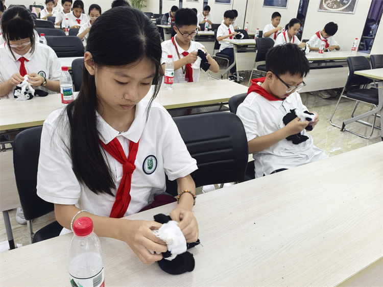 最令人振奋的环节莫过于亲手体验制作。在工厂工作人员的细致指导下,同学们动手制作起熊猫娃娃:从小心翼翼地对齐布料、裁剪轮廓,到一针一线缝合部件、翻面整理,再到将棉絮均匀填充让熊猫逐渐“饱满”起来——大家全神贯注,耐心完成每一道工序。当最终亲手制作的熊猫娃娃呈现在掌心时,满满的成就感和欢声笑语洋溢了整个工坊。同学们彼此展示作品、交流制作心得,现场气氛热烈。
