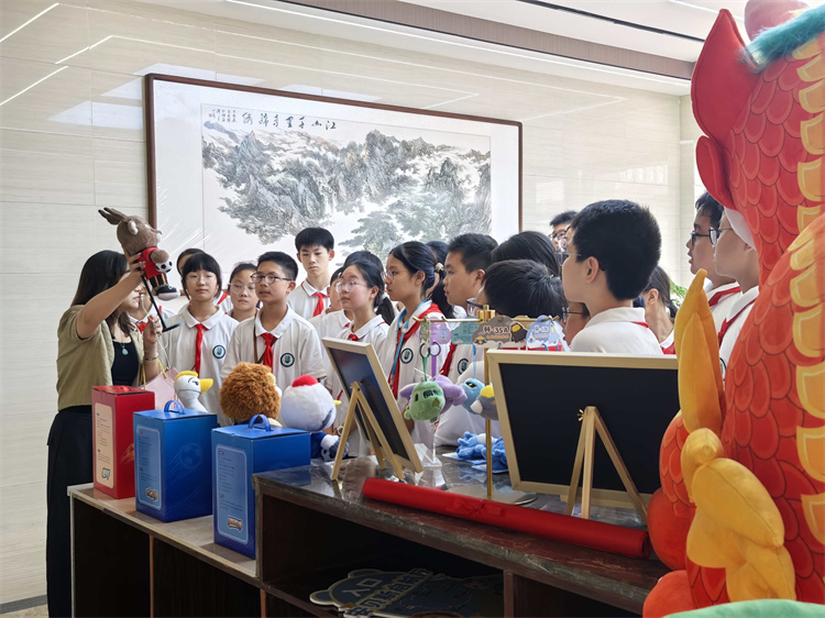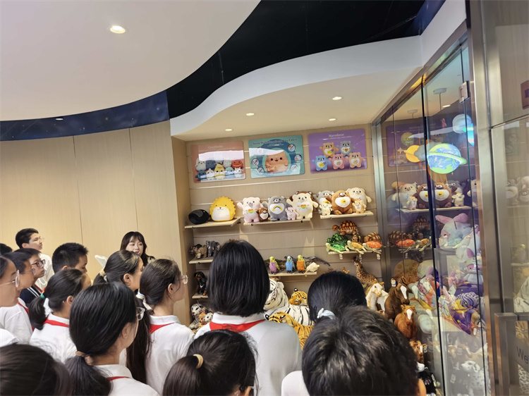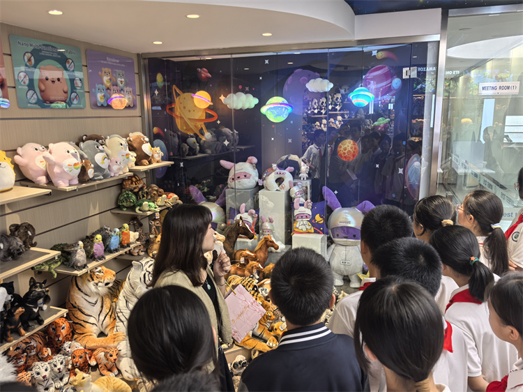 活动伊始,工厂讲解员带领同学们步入设计展区。展区内陈列着琳琅满目的娃娃设计手稿——从灵动可爱的动物造型线图,到色彩缤纷的服饰搭配方案,再到标注精确的细节结构图,不一而足。讲解员介绍,每一款娃娃从创意萌芽到最终成品,都需经过设计师反复推敲与修改,确保造型、比例与细节完美呈现。当图纸上的线条与展柜中的实物娃娃一一对应时,同学们频频发出赞叹,纷纷俯身细看,品味设计之中蕴藏的智慧与巧思。