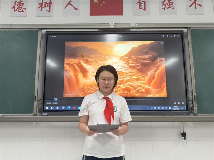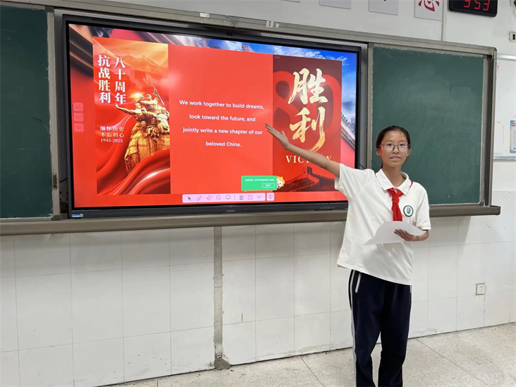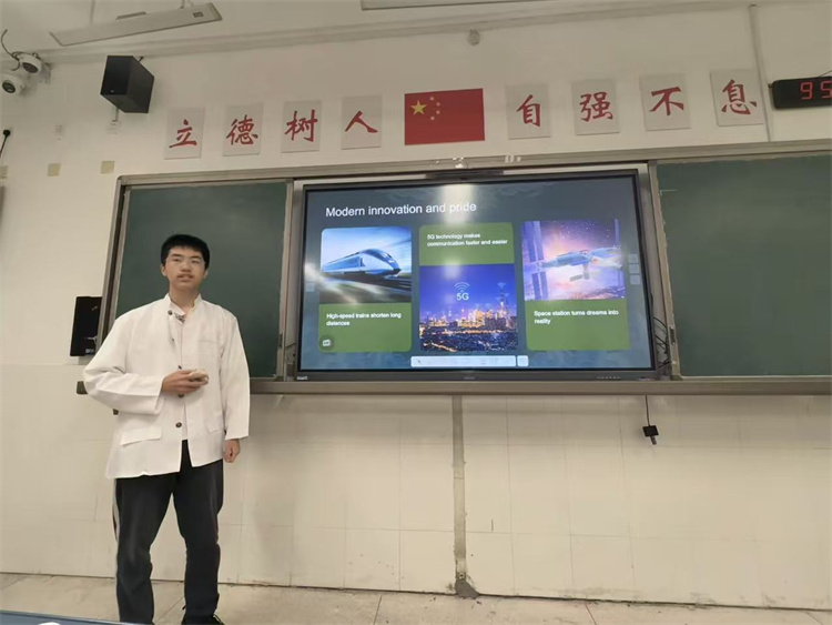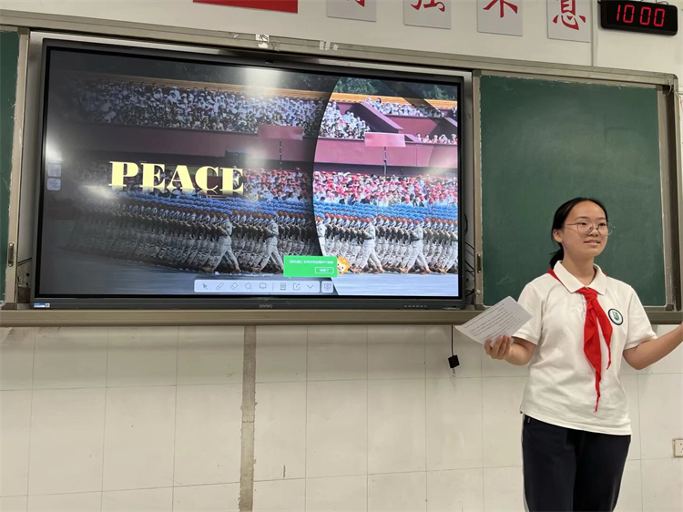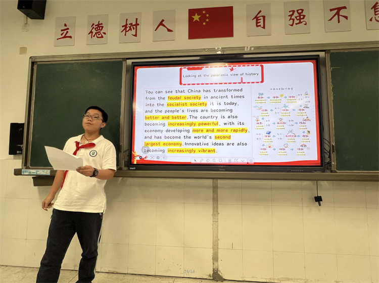 比赛现场,20余名初三选手依次登台,他们紧扣主题,用生动的英语表达传递真挚情感。有的聚焦“中国速度”,以高铁、5G等身边变化为例,讲述“中国式现代化”的生动实践;有的呼吁“铭记历史,吾辈自强”;还有的结合航天梦、科技发展,分享“生在红旗下”的自豪。他们发音纯正、情感饱满,既有对历史的敬畏,更有对祖国未来的憧憬,赢得台下师生阵阵掌声。