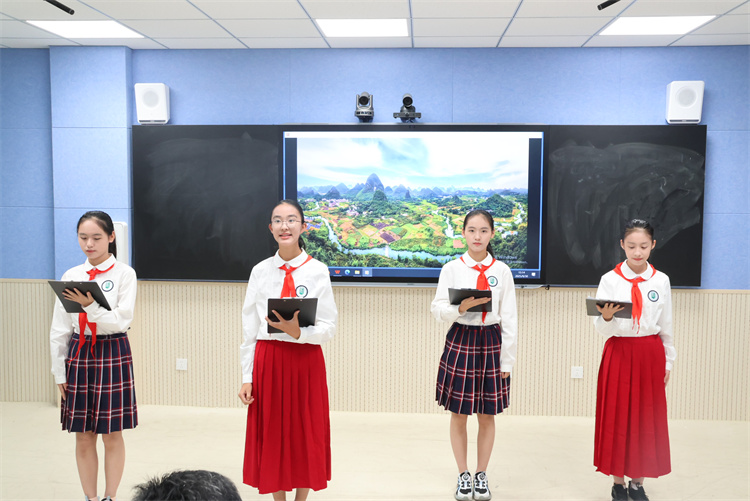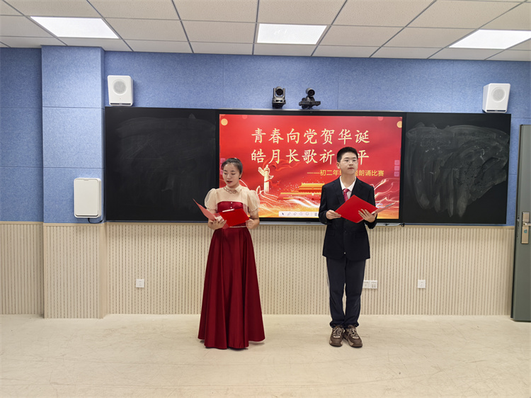 9月30日下午,树人学校九龙湖校区初二年级“青春向党贺华诞,皓月长歌祈和平”红色主题诗歌朗诵比赛以直播形式在微格教室隆重举行。十六个班级组成的九个节目依次登台,以铿锵之音抒赤子之情,以青春之志颂时代华章。各班同学在教室认真观看,聆听爱国之音,学习朗诵技能,厚植爱国情怀。