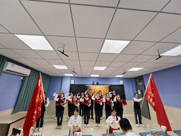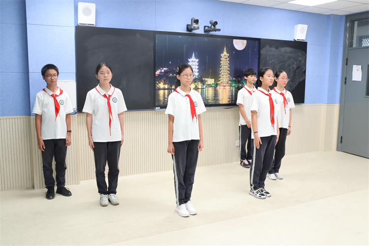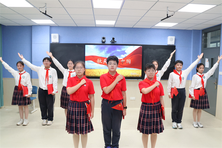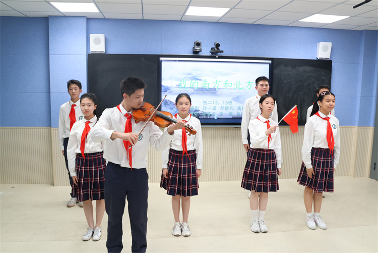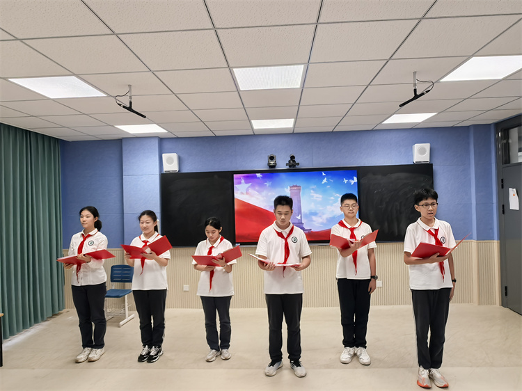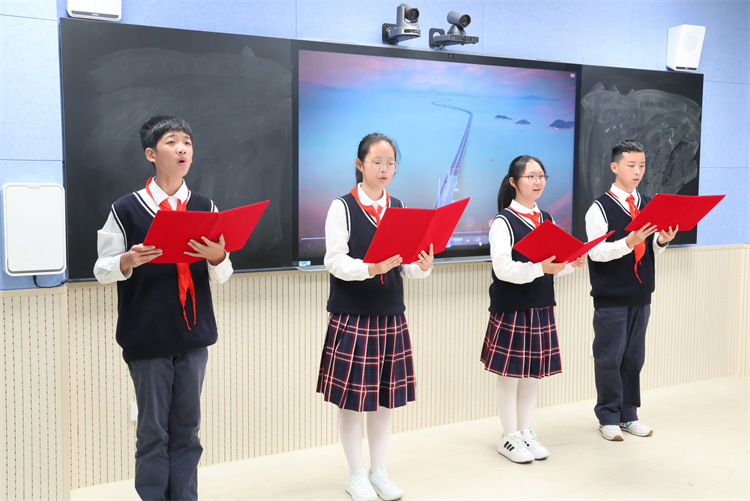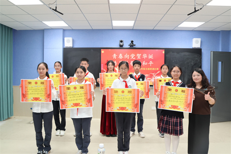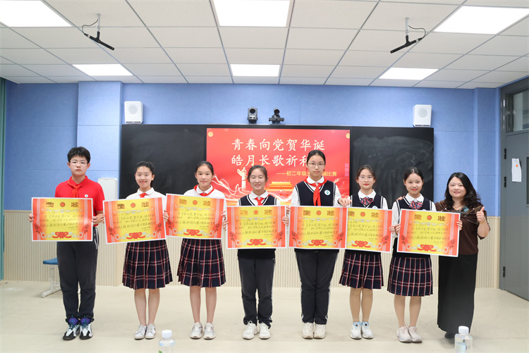 语文组夏文翔老师、孙航舣老师,音乐组谢晓利老师三位评委也对本场比赛给予了高度评价,并从语言表达、情感渲染、舞台表现等维度进行综合评分,评选出了特等奖四个节目,一等奖五个节目。由语文组夏文翔老师宣布获奖班级名单,由初二年级主任张引为获奖班级颁奖。此刻,掌声雷动,荣誉背后,是认真排练的汗水,更是新时代少年对党与祖国的深情礼赞。