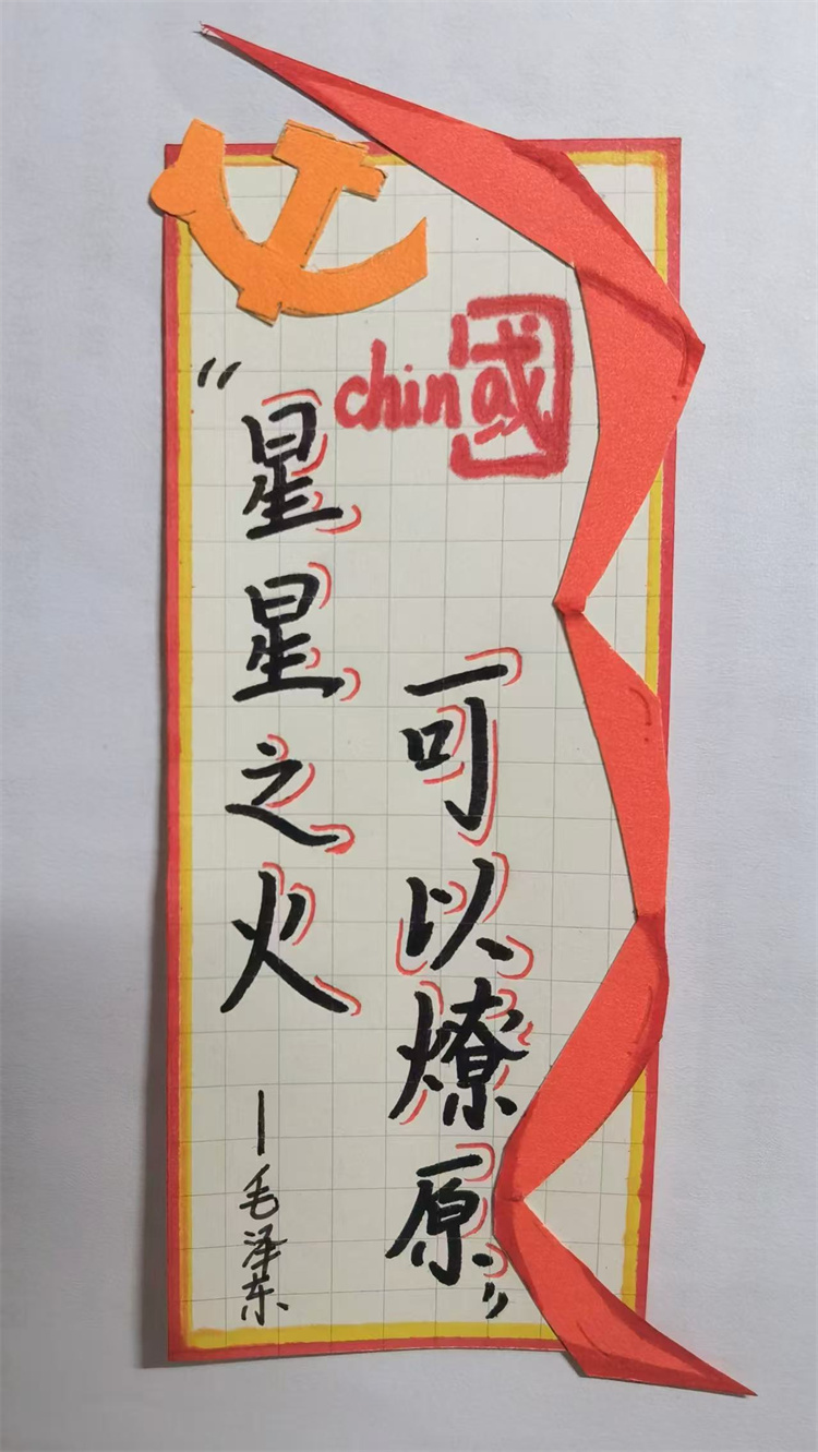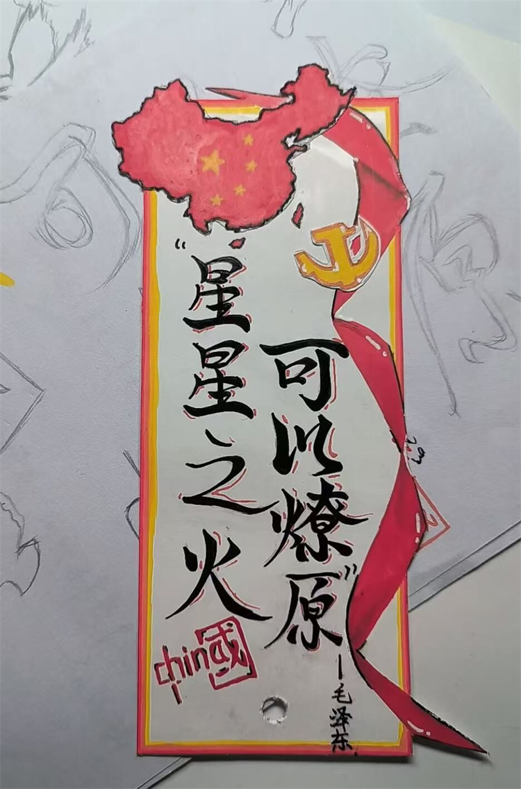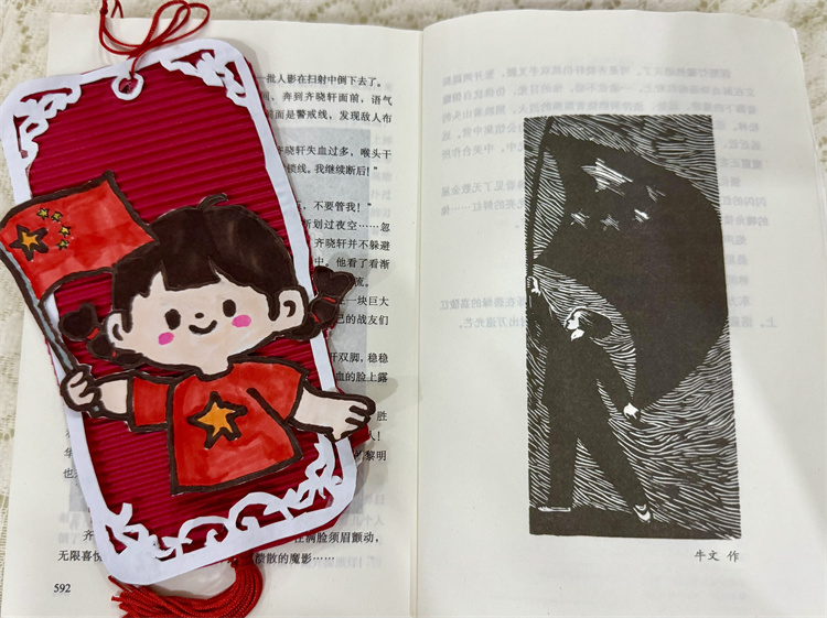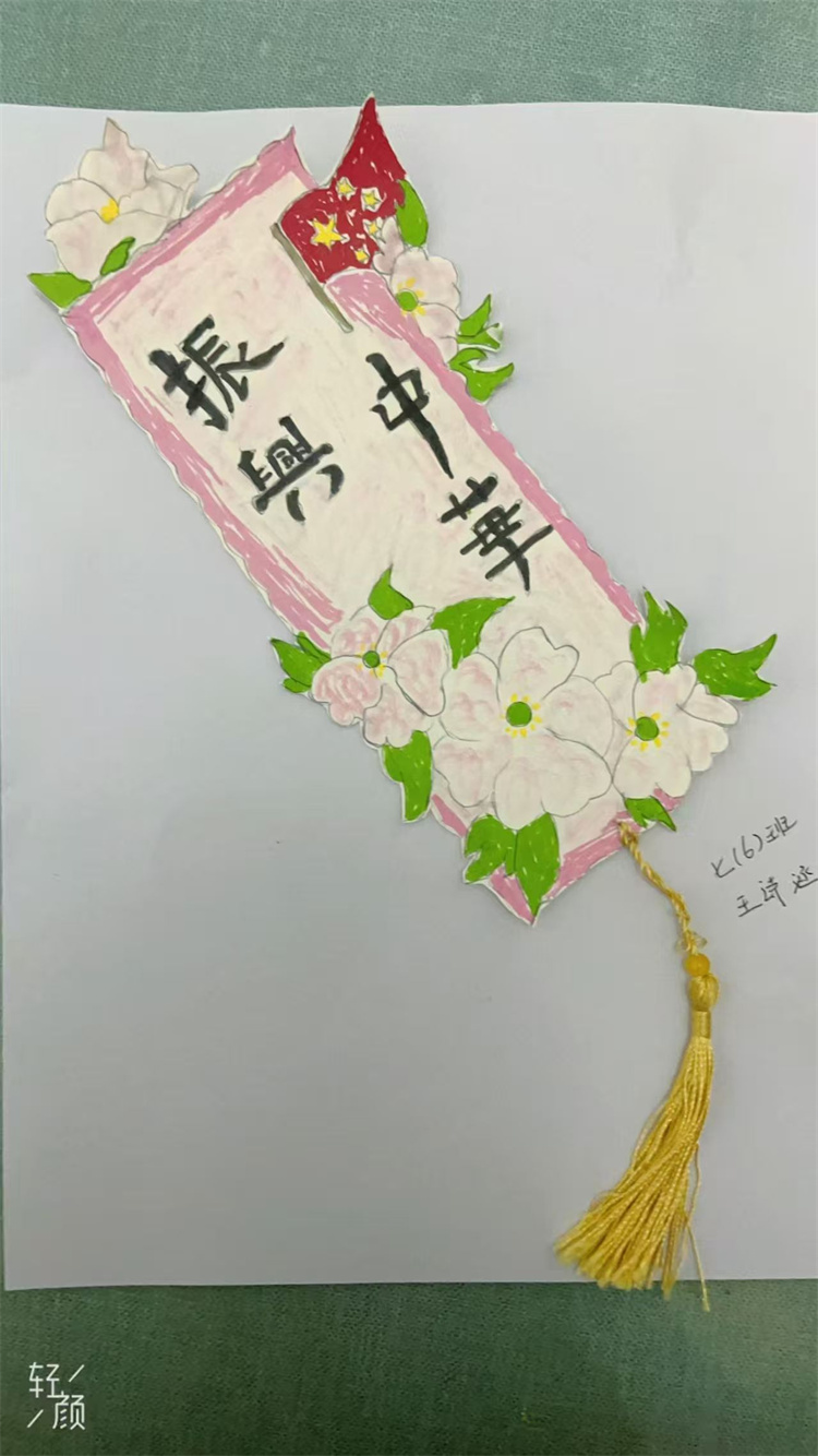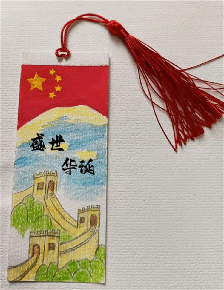 那些小巧的书签,像是“可以随身携带的爱国小卡片”。我们用卡纸、木片、树叶等材料,做出各式各样、富有创意的小书签。虽然不大,却装满了我们对祖国的热爱和祝福。