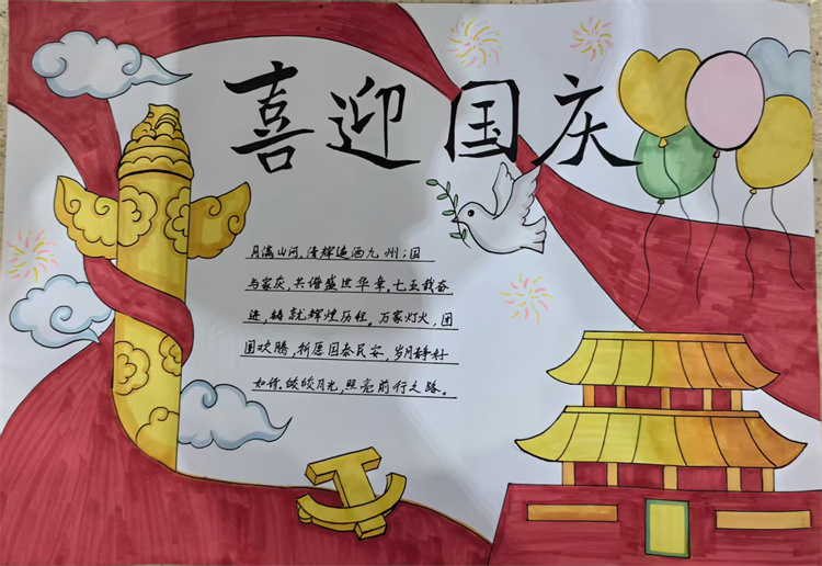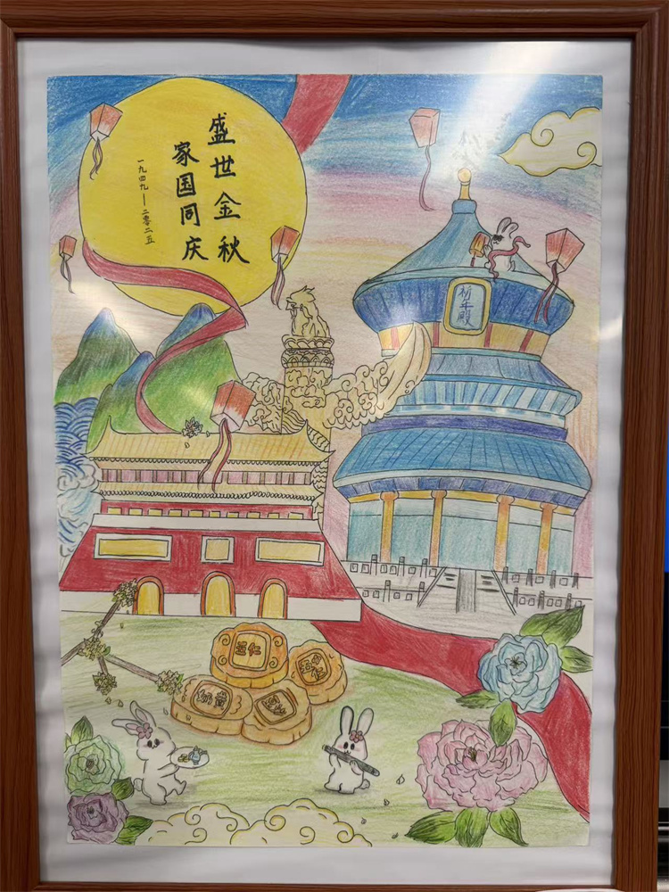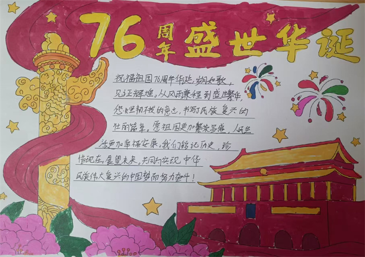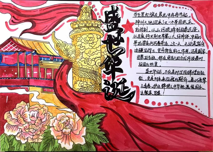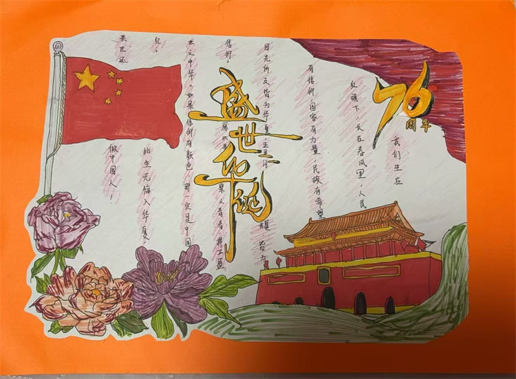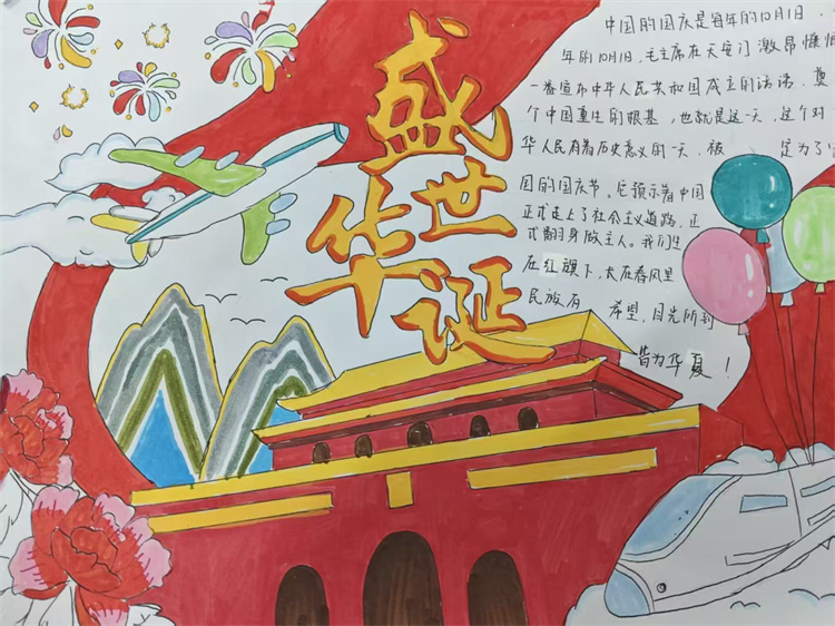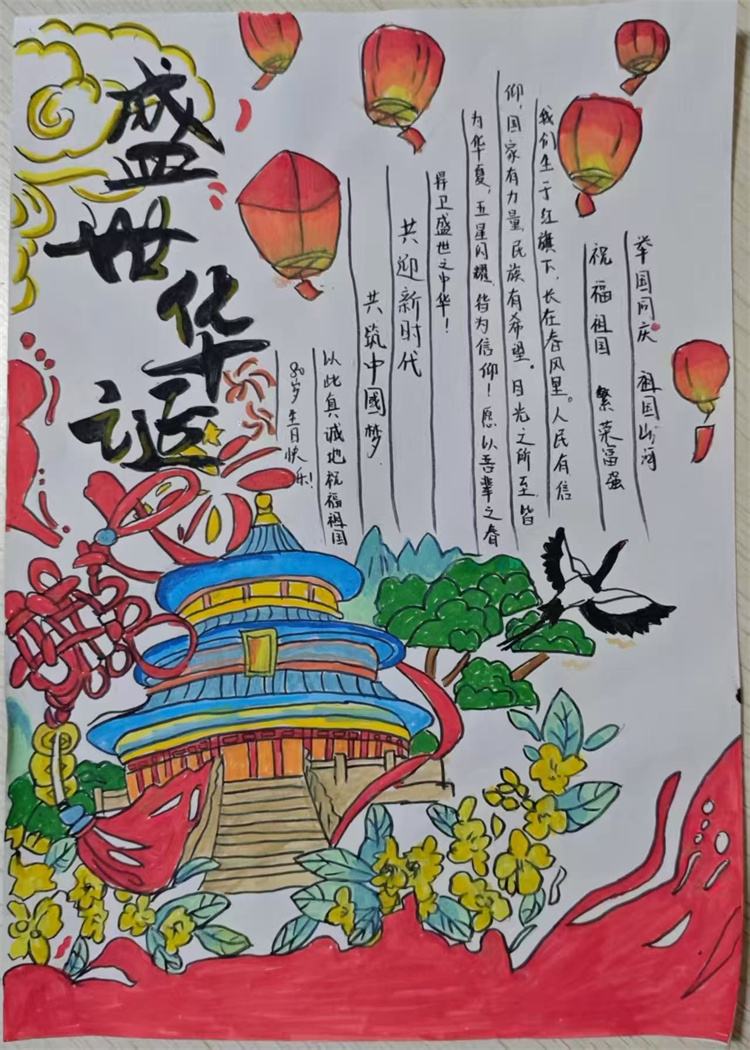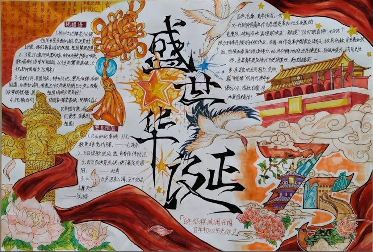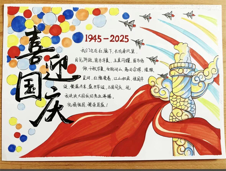 绘画和手抄报就像一扇扇“多彩的窗口”。同学们用画笔勾勒祖国的壮丽景色,也画出了我们心中的理想与担当。每一幅画、每一种颜色,都藏着我们深深的敬意和美好的祝愿。