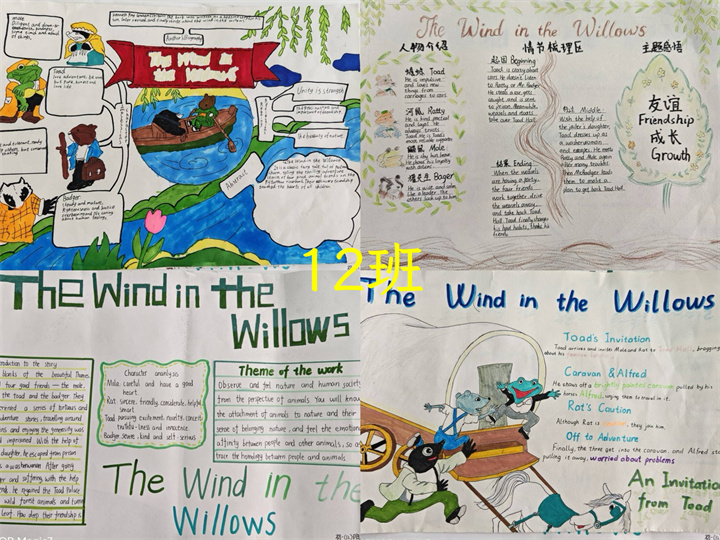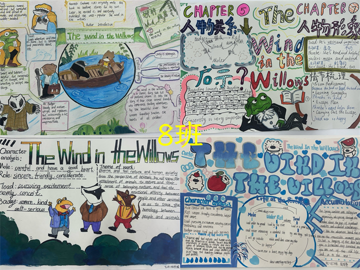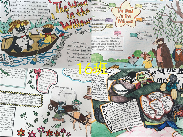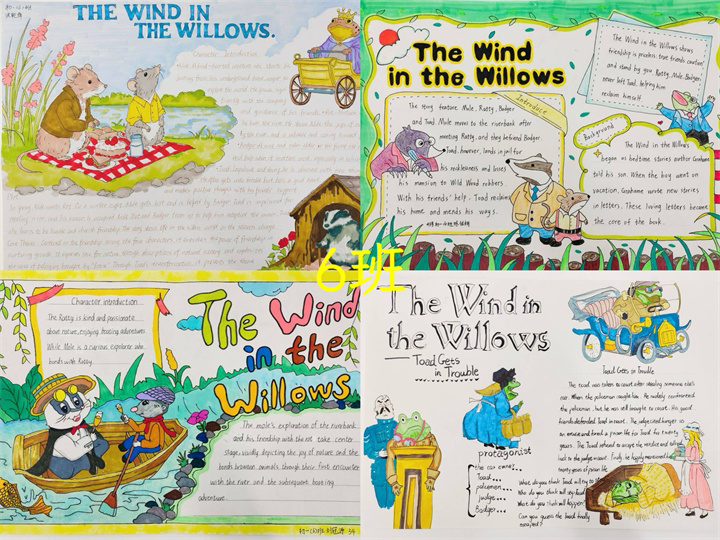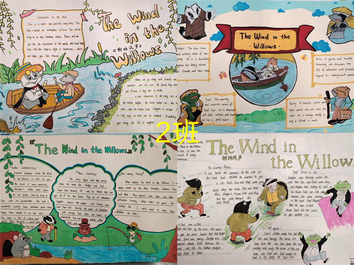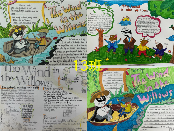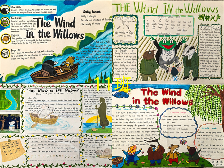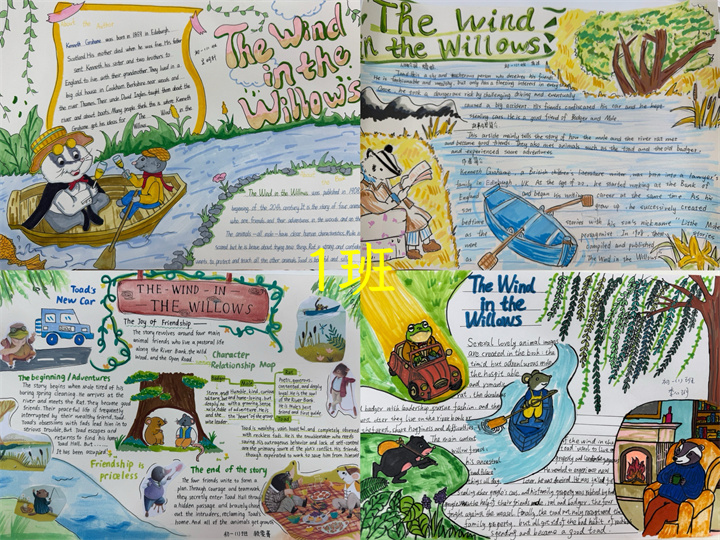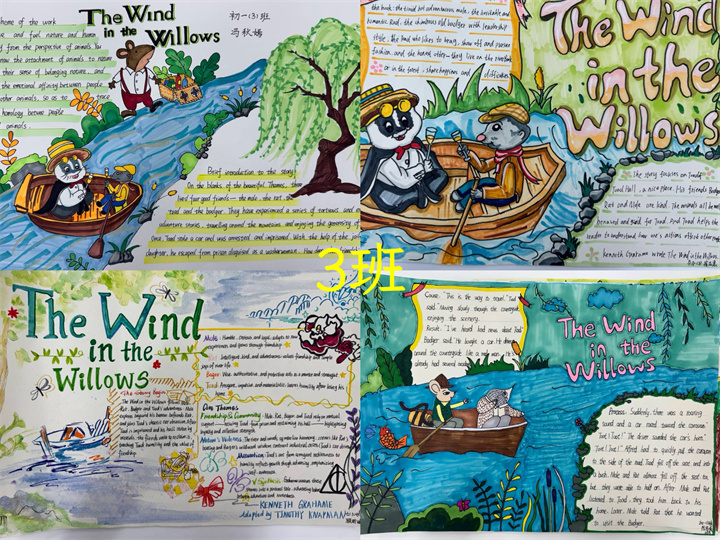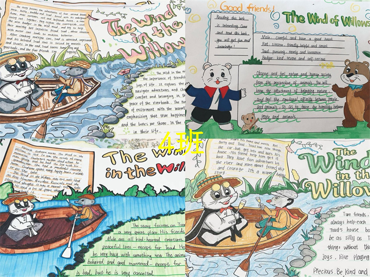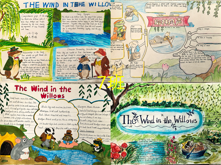 本次手抄报创作活动将英语学习与文学鉴赏、艺术创作深度融合。假期中,同学们沉浸于《柳林风声》这个充满友谊与冒险的童话世界,他们精心构思,巧妙设计,将书中憨厚的鼹鼠、机灵的河鼠、傲慢的蟾蜍和沉稳的獾先生等经典形象栩栩如生地呈现在画纸上。一份份手抄报不仅版面设计新颖、色彩搭配和谐,更包含了精彩的英文故事简介、深刻的阅读感悟以及优美的词句摘抄,充分展现了初一新生的无限创意与扎实的英语功底。