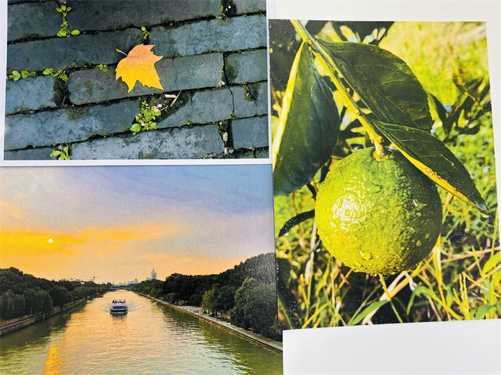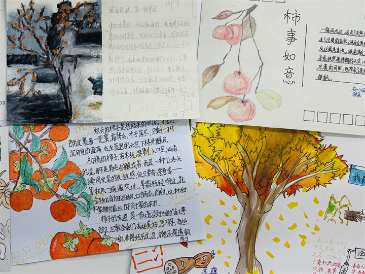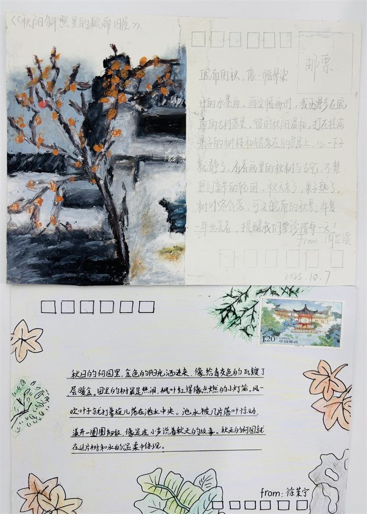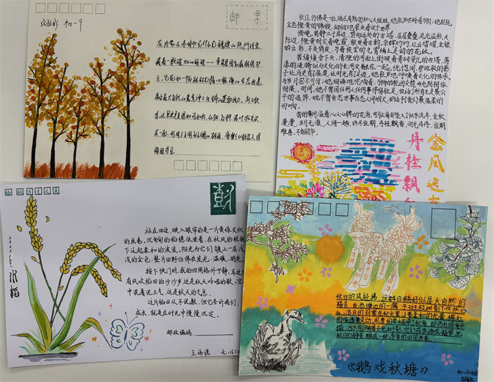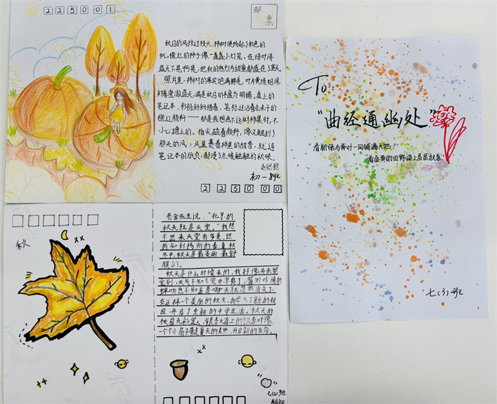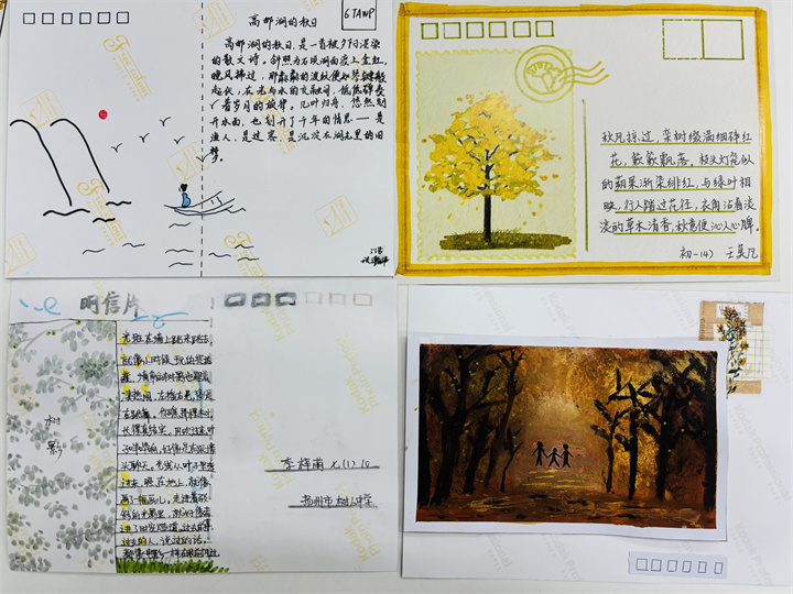 在众多秋日影像中,同学们精选出最具情感张力的一张,亲手制作成明信片。背面不仅绘有充满秋意的装饰图案,更附上了一段段灵动的文字。有的学生模仿第一单元写作,将所学与所见融会贯通,真正做到了读写结合。有的学生则写出了独具个性的文字:“这片落叶在风中打了个旋,轻轻落在我掌心,仿佛整个秋天都安静了下来。”这些文字既写实景,又抒真情,将瞬间的感动升华为永恒的记忆。
