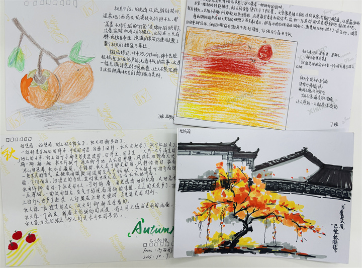 除了实践创作,同学们还沉浸于古今中外描写秋天的文学作品中,从郁达夫的《故都的秋》到济慈的《秋颂》,在比较阅读中感受不同文化、不同心境下的秋日韵味。这一过程不仅丰富了审美体验,也让同学们在跨越时空的对话中,建立起自己与秋天、与文学之间更为深厚的联结。