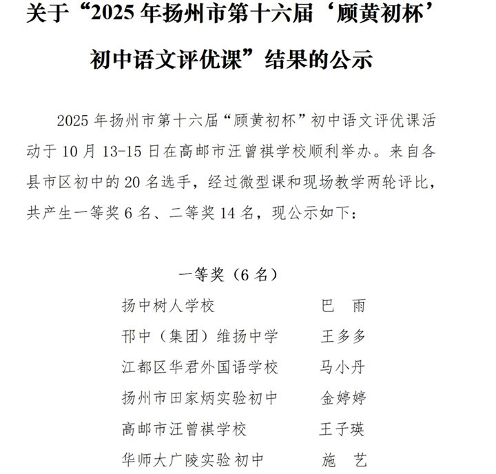 我校九龙湖校区巴雨老师在扬州市第十六届“顾黄初”杯初中语文评优课中力拔头筹。巴老师于市直选拔脱颖而出,继而在扬州大市决赛中与 20名优秀选手角逐,经两轮比拼,最终斩获一等奖第一名!