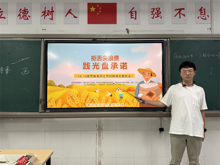 班会中,各班班主任借助短视频,展示农民耕种的辛劳与全球饥饿人群的现状,让学生直观感受“粒粒皆辛苦”。各班还开展 “粮食知识问答”,从水稻生长周期到我国粮食产量,同学们积极抢答,在互动中掌握粮食常识。部分班级组织“节约粮食倡议书” 签名活动,学生们郑重签下名字,承诺“光盘行动 从我做起”。