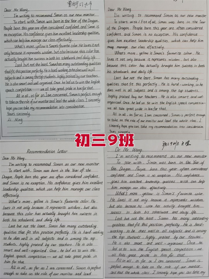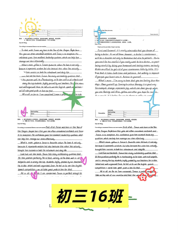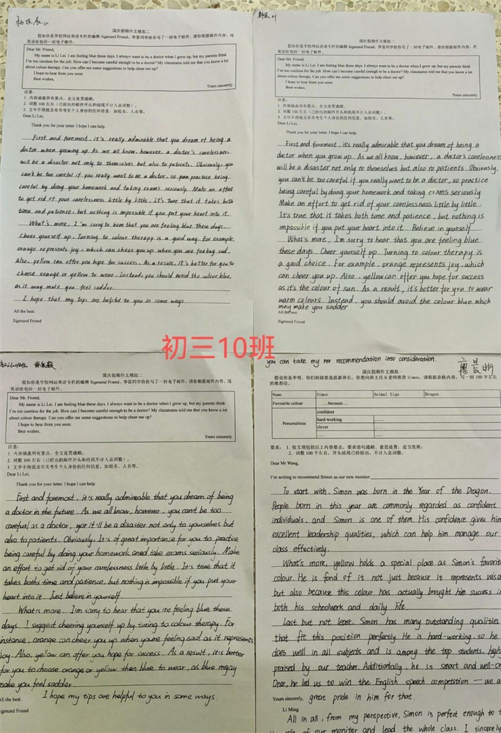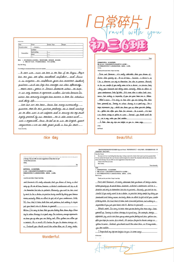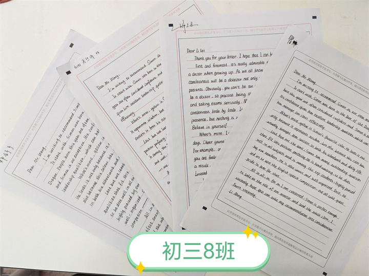 为提升学生英语写作能力与书写水平,激发学习英语的热情,九龙湖校区初三英语组于国庆假期组织了英语作文书写比赛,围绕“推荐信”“提供建议”两大主题展开创作,初三学子积极参与,展现了扎实的英语功底与良好的书写素养。