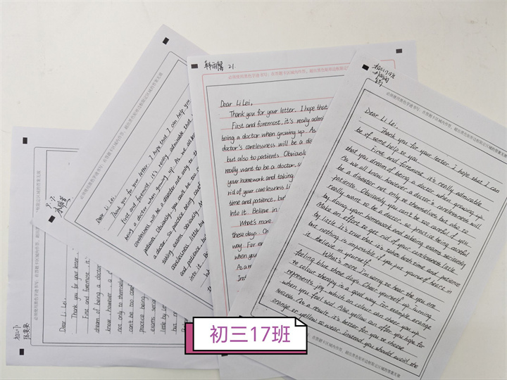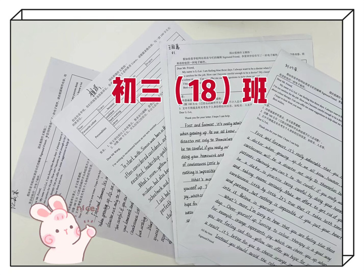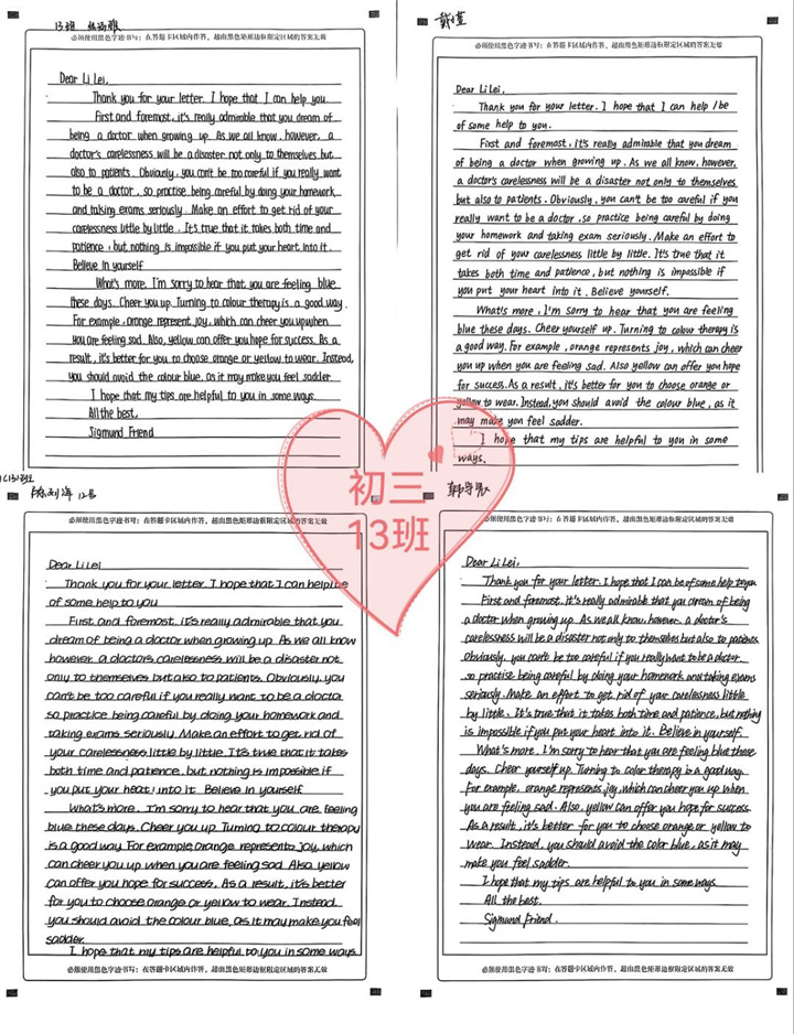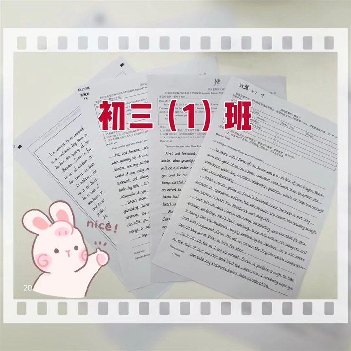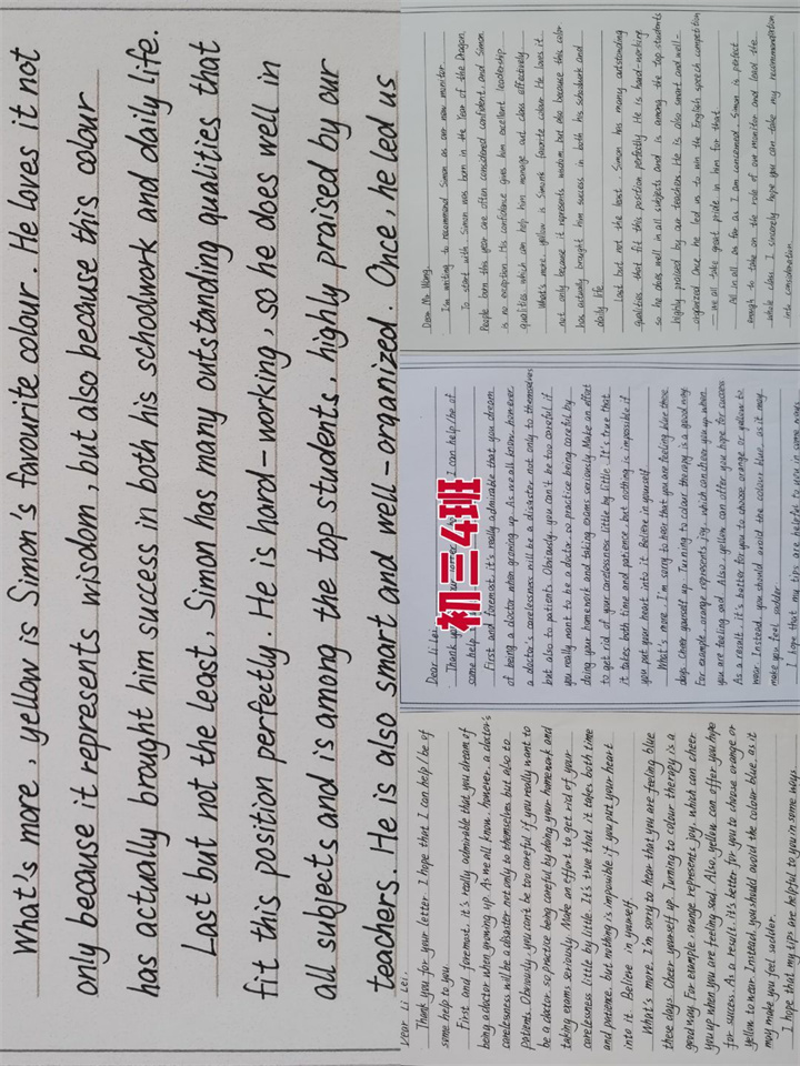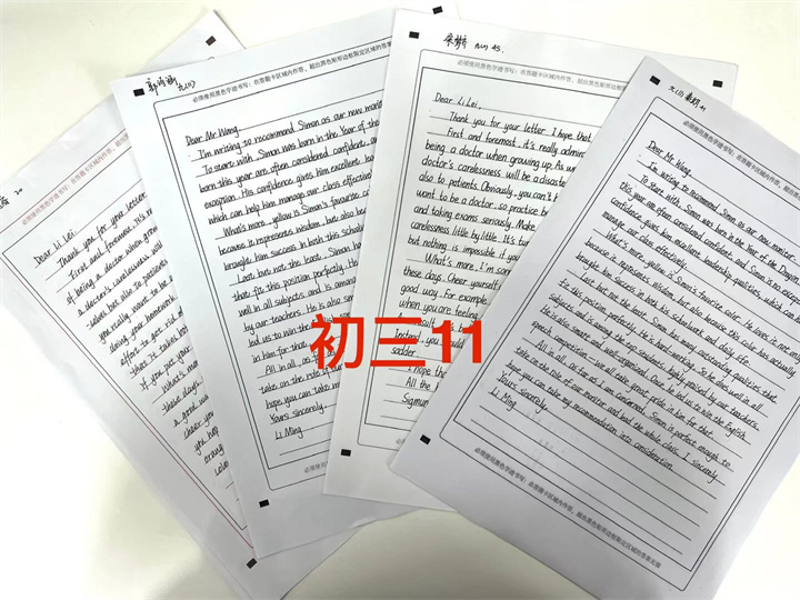 为提升学生英语写作能力与书写水平,激发学习英语的热情,九龙湖校区初三英语组于国庆假期组织了英语作文书写比赛,围绕“推荐信”“提供建议”两大主题展开创作,初三学子积极参与,展现了扎实的英语功底与良好的书写素养。