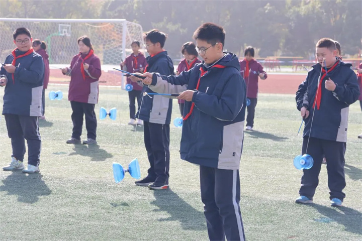 赵燕老师抖空竹教学,藏着满满的趣味与成长。赵老师耐心拆解每一个动作:握杆要稳、拉线要匀、起抖要轻,再带着学生一遍遍练习平稳旋转、左右摆动的基础招式。看似简单的抖空竹,却需要手、眼、身、步的默契配合,学生从笨拙到熟练,从慌乱到从容,在玩转空竹的过程中,不仅增强了手部力量与身体协调性,更在感受传统运动乐趣的同时,学会了专注与坚持。
