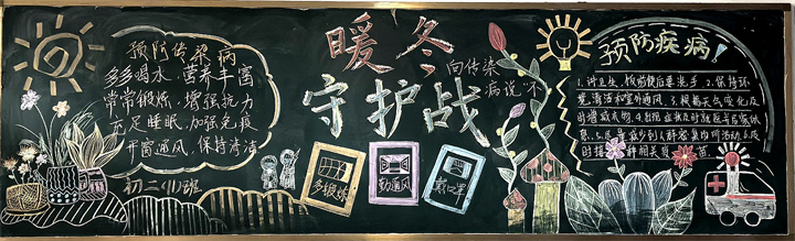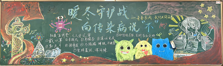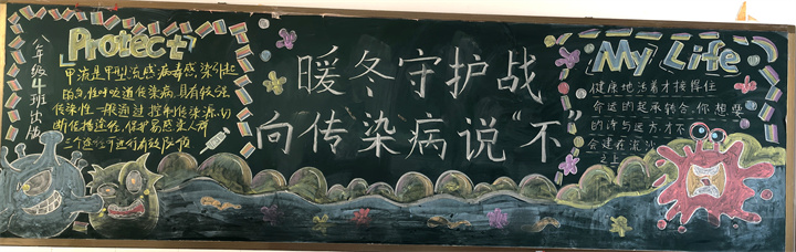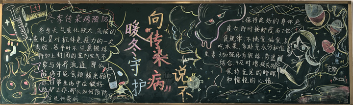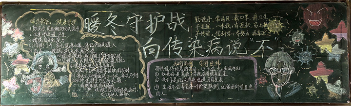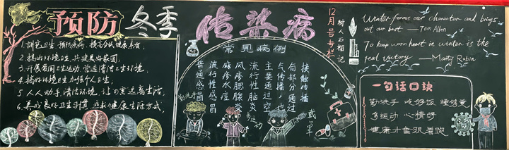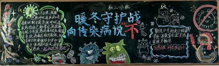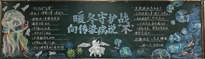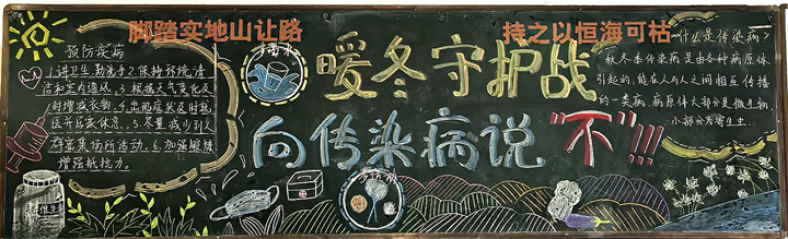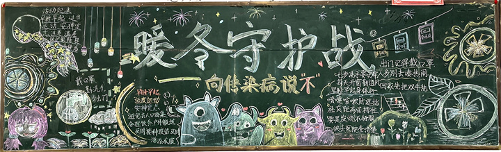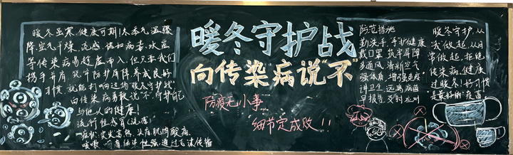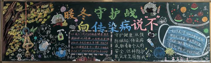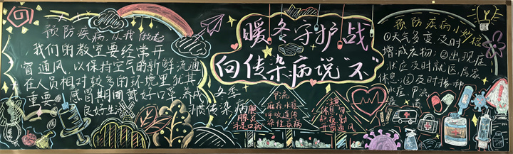 为进一步筑牢校园传染病防控防线,增强全体师生冬季健康防护意识,九龙湖校区精心举办“暖冬守护战,向传染病说不”主题黑板报评比展示活动。各班级积极响应、踊跃参与,用多彩画笔勾勒出一道兼具知识性与观赏性的校园风景线。