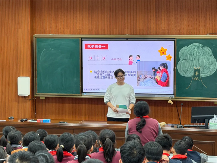树人学校李威龙老师率先执教《在奉献中成就精彩人生》一课。李老师以志愿服务为切入点,通过“奉献需要宣传吗”“奉献是为了宣传吗”“下次我们还来吗”三个递进式议题,巧妙引入“初一学生志愿表演宣传”与“李杰阿姨数年义务理发却默默无闻”的对比案例,直击“形式主义志愿服务”痛点。课堂上,学生们围绕“奉献之心与奉献之行”展开激烈辩论,在思维碰撞中明晰“奉献=(真心+真行)×N”的深刻内涵,深刻领悟到奉献的价值在于持之以恒的坚守,而非流于表面的宣传。