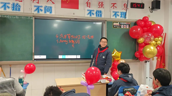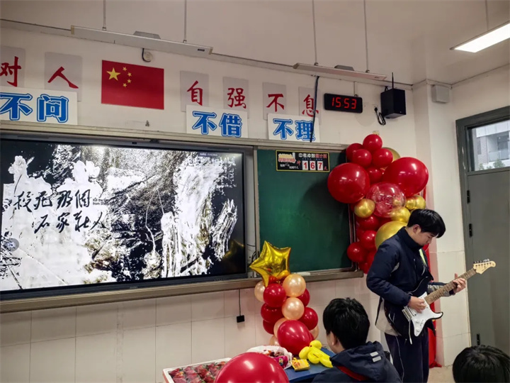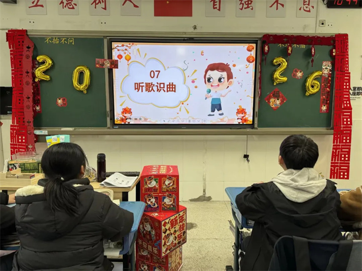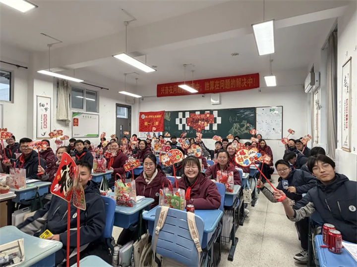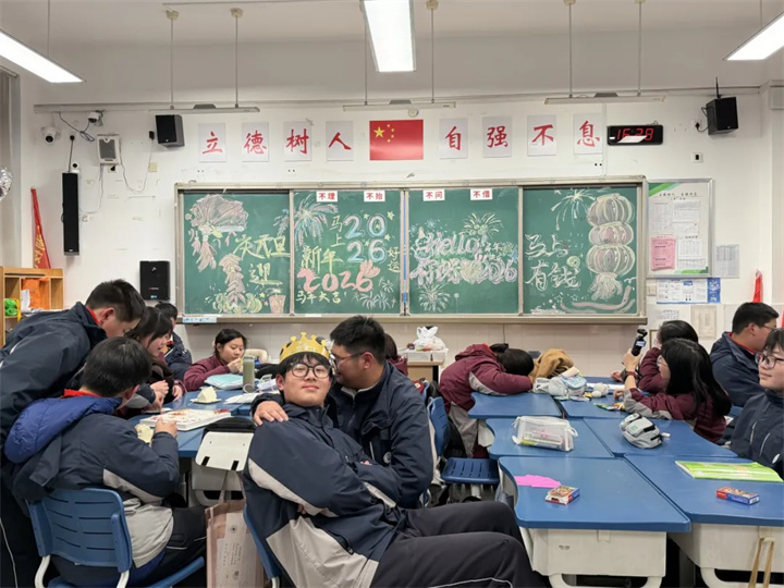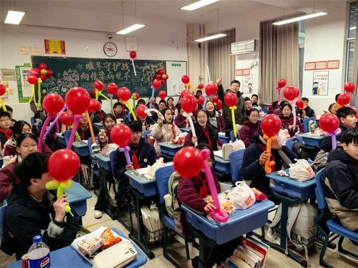 走进各班教室,目之所及皆是焕然一新的景象。五彩斑斓的气球簇拥着飘在天花板下,恰似一串串摇曳的梦。绚丽的彩带纵横交错,将教室装点得喜气洋洋。精致的挂饰随风轻晃,平添几分灵动俏皮。各班的黑板更是别具匠心,彩色粉笔勾勒出的新年祝福语,或娟秀或豪迈,一笔一划都藏着同学们对新一年的无限期许。