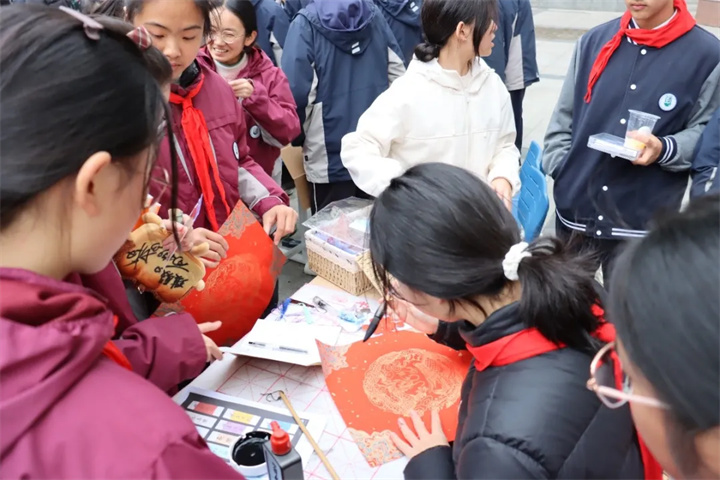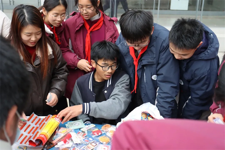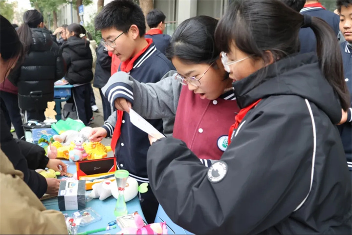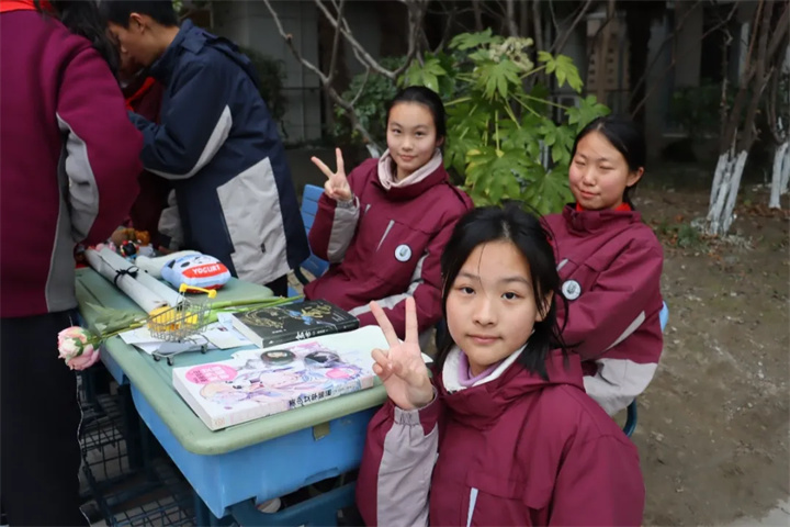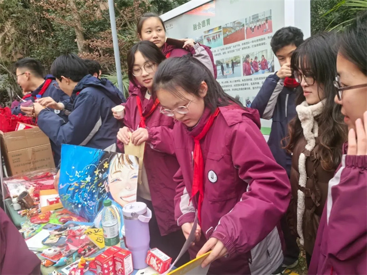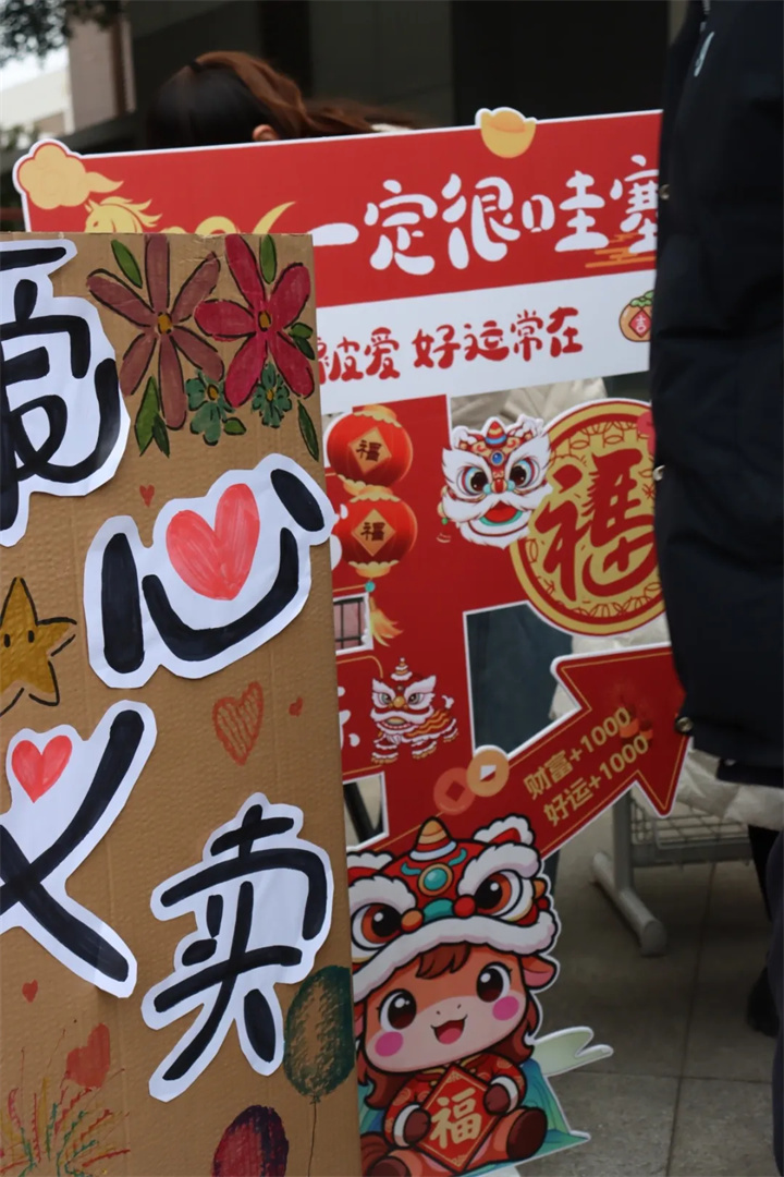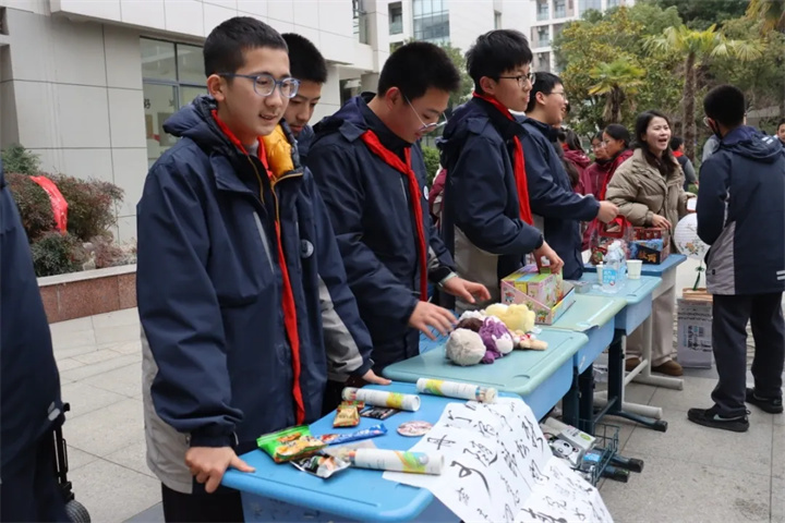 校园里处处洋溢着欢声笑语。初一在香樟路、初二在大成楼南北广场的义卖摊位依次排开,各班精心布置的展位各具特色:手绘的宣传海报色彩鲜艳,琳琅满目的义卖品整齐摆放,书籍、文具、手工艺品、书画作品应有尽有,部分班级还推出现场写春联、手工制作、套圈竞猜等互动环节,精彩的现场表演更吸引了师生们驻足围观,叫卖声、讨价还价声、欢笑声交织成一曲温暖的爱心乐章。
