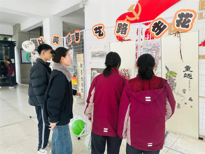 展览共汇集学生书画作品百余幅,涵盖国画、书法、水彩、素描等多种形式。作品或挥毫泼墨,或工笔细描,勾勒“艺路生花”的绚烂图景。同学们以笔为舟,以彩为翼,在画卷之间描绘心中愿景,既展现了扎实的传统功底,又彰显出蓬勃的创新活力。