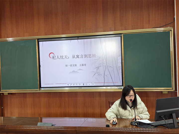 “强师强技赋能,优质优效育才”环节中,两位教师分享教学实践与心得。初一语文组王露莹老师以《杞人忧天》为例,围绕教材学情、目标重难点等五大核心模块,分享了兼具知识性与思辨性的教学设计,为同行提供了优质实践参考。刘杨阳老师结合“作业评讲”课学习经历,提出课堂应坚持以学生为主体,尊重个性差异、激发学习潜能,引导学生主动探索知识,培养自主学习能力的教学理念,获得在场教师广泛认同。