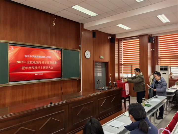 以初心守底线 以责任铸师魂。树人学校党委书记唐炜代表党委、校级领导班子作年度述职述廉报告,九龙湖校区作分会场观看直播。唐书记围绕一年来学校在党建引领、教育教学改革、师资队伍建设、学生全面发展等方面取得的成效作了系统汇报。随后,与会教师对领导班子进行民主测评,过程规范有序,体现了学校管理的民主性与透明度。