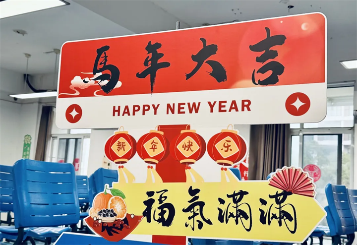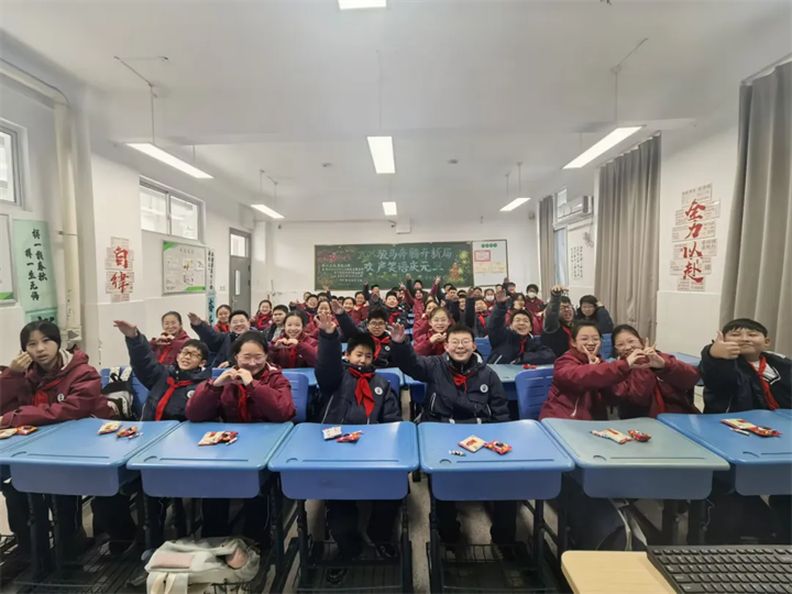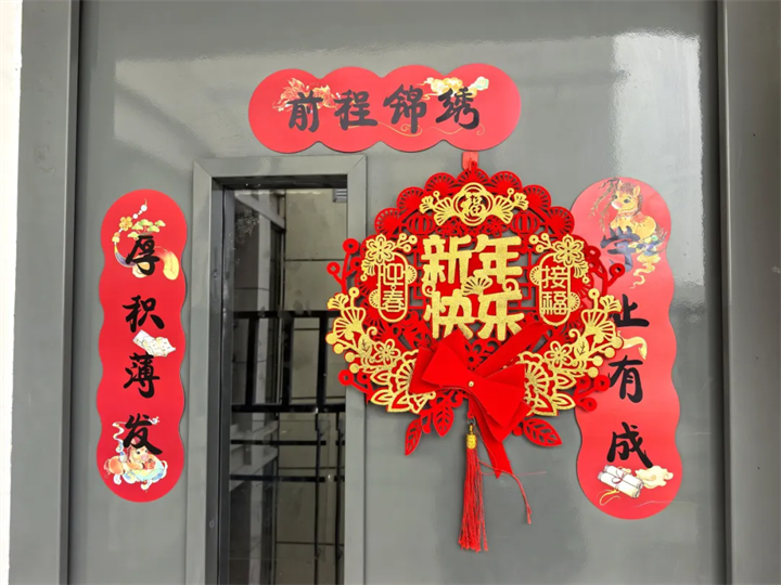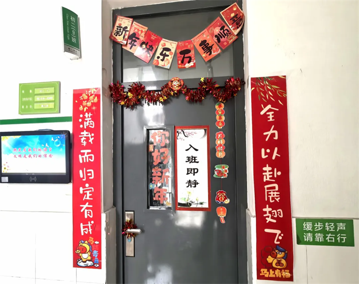 活动中,各班师生匠心独运,用最富年味的元素将教室装点得红火喜庆。一幅幅墨香氤氲的春联和气势恢宏的“福”字斗方张贴在教室门廊,笔力遒劲的“跃马迎春”“前程似锦”等祝福语寄托着对新年学业、班级发展的美好期许。彩色拉花如虹如练,在教室上空交织出绚烂的穹顶,与窗户上寓意吉祥的剪纸窗花相映成趣。放眼望去,每一间教室都化身为一片红色的、欢乐的海洋,浓浓的年味与青春朝气在此完美融合。