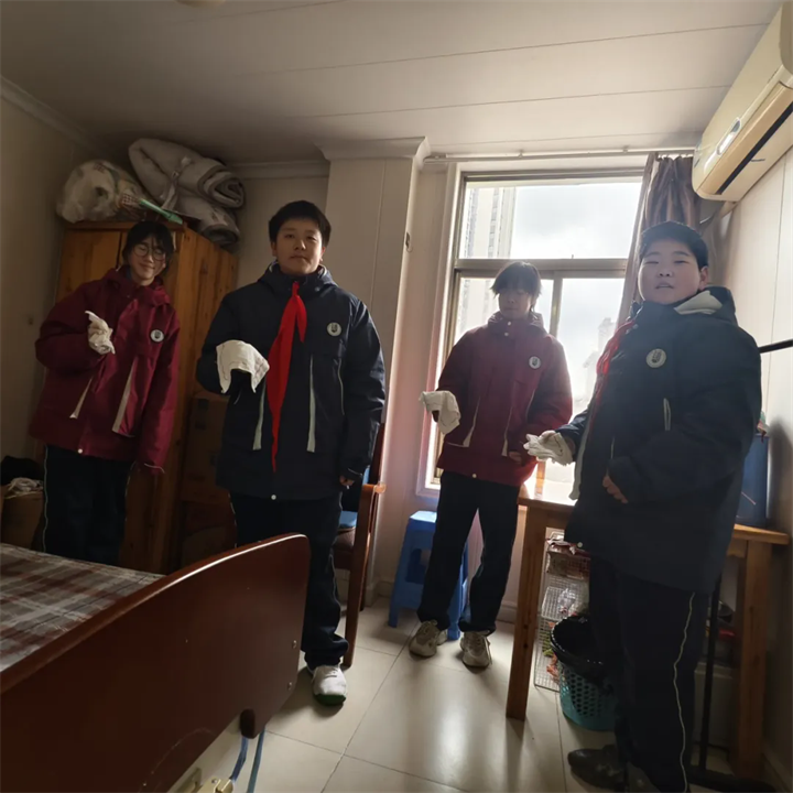 此次实践活动恰逢扬州雨雪天气,道路结冰,交通极为不便。然而,同学们克服重重困难,依然准时到达养老院。他们专程带来了物资,确保老人们能在温暖舒适的环境中活动自如。养老院负责人感动不已,他表示:“孩子们顶风冒雪而来,不仅带来了物资,更带来了社会的温暖。” 活动现场,同学们迅速分组展开服务。有的同学仔细帮老人整理房间、打扫卫生,擦拭窗户上的冰花,让房间焕然一新;有的同学陪老人聊天,倾听他们的人生故事,养老院里笑声不断;还有的同学带来精彩文艺节目,展示了传统的书法艺术,赢得老人们阵阵掌声,又为养老院增添了年味。