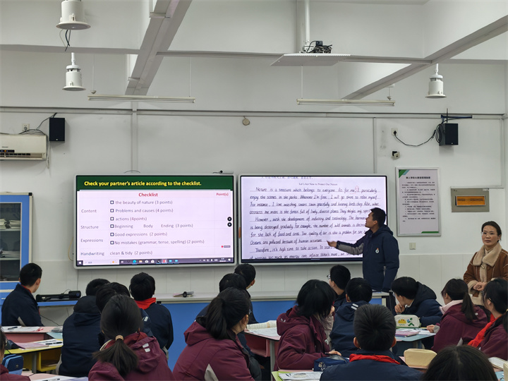 ·英语创新复习课:姚远老师的 “Humans and Nature” 单元整合复习课,融合 AI 情境教学,通过小组讨论、视频观看、听力训练、AI 辅助写作等多元活动,在语言习得中渗透环保意识与思辨能力,实现了师生双向互动与学生探究式学习的深度融合。