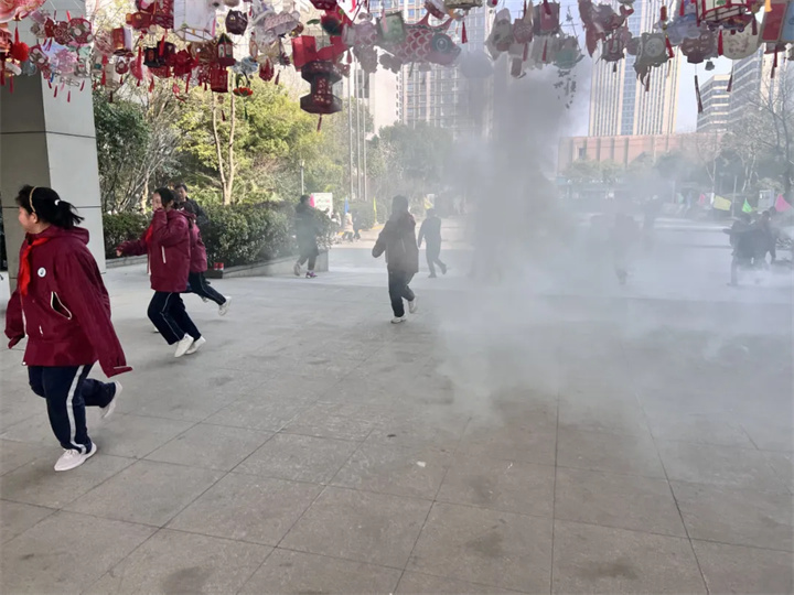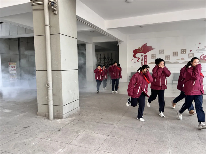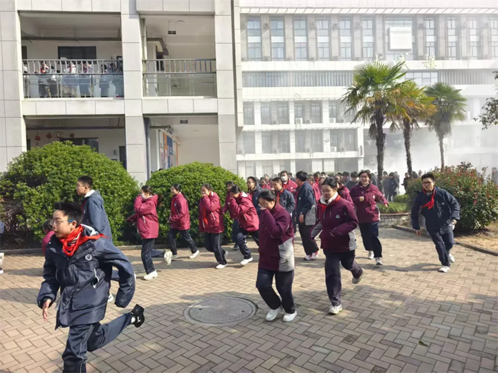 随着警报声响起,演练正式启动,现场设置了烟雾模拟场景,增强了逼真感和体验感。各班级教师迅速组织学生按照预定路线疏散。同学们捂住口鼻,弯腰低姿,沿楼梯快速有序撤离至操场安全地带。整个过程紧张有序,仅用数分钟即完成全员集结。集结完毕后,各班清点人数并逐级上报,确保无一人遗漏。