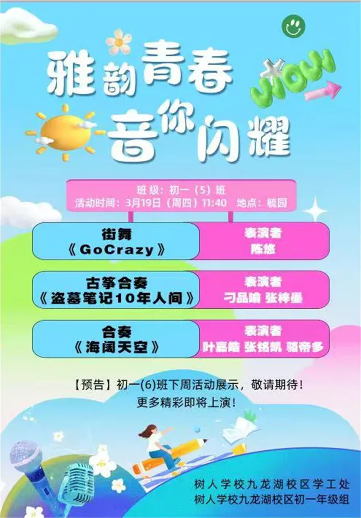 春风轻吹,暖阳温柔。19日,树人学校九龙湖校区初一(5)班的同学们欢聚毓园,一场属于青春与梦想的“雅韵青春” 艺术汇演完美落幕,在春日校园里留下了浓墨重彩的美好印记。