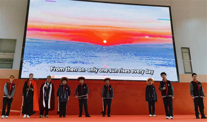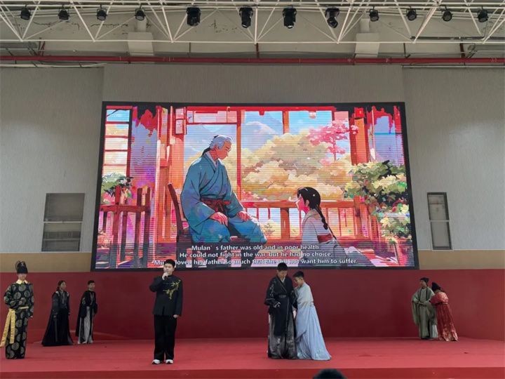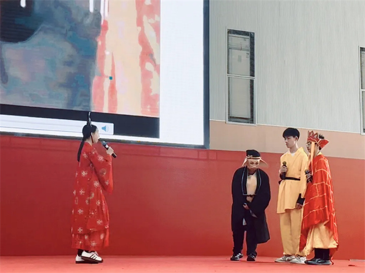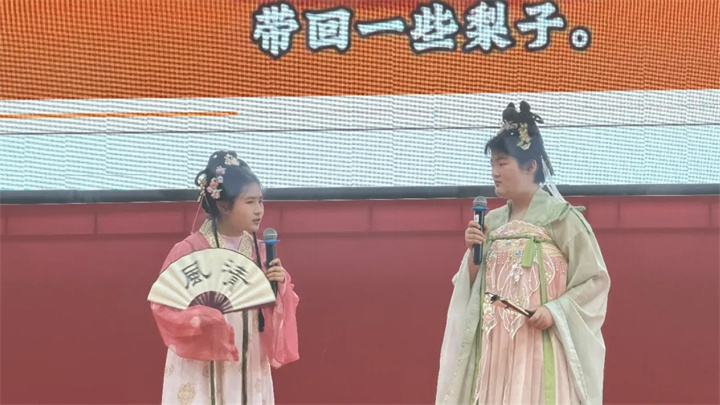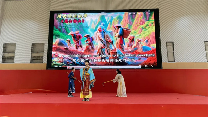 活动现场,初一16个班级轮番登场。同学们以流利的英文,生动演绎了《黛玉葬花》《愚公移山》《花木兰》《马良与神笔》等经典故事,还通过《中国茶文化》《从自行车到高铁》《觉醒年代》等演讲,从文化、时代、历史等维度传递中国精神。舞台上,同学们台词流畅、情感饱满,将故事中的人物形象与文化内涵展现得淋漓尽致,赢得现场阵阵掌声。
