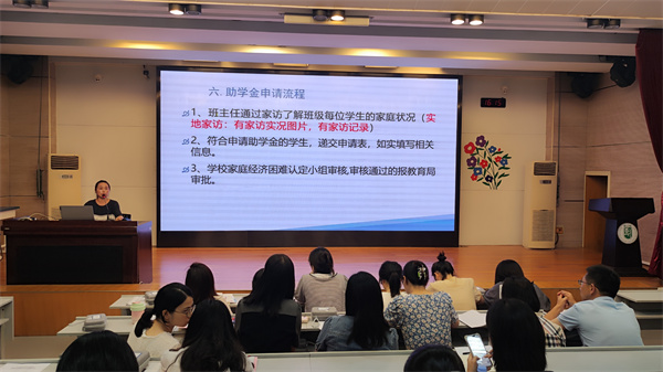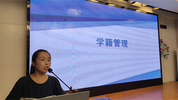 学工处徐梅老师对于学籍管理、医保等相关制度解读。徐老师对于休学、复学、学籍转出、学生请假制度以及南门街校区办理出门证手续等进行了逐一说明,同时,她还讲解了学校助学金申请流程与学生医保等相关问题。