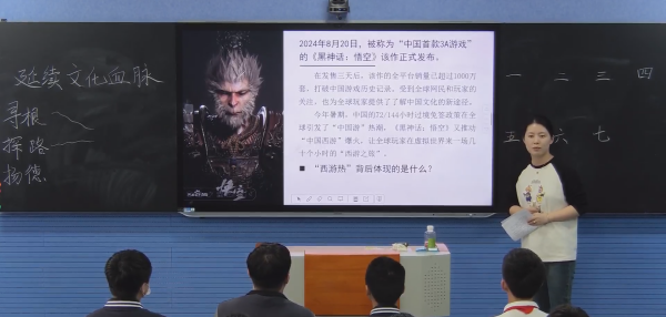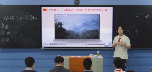 苏琳玲老师巧妙地将课堂设置成一次闯关游戏,呼应了游戏《黑神话悟空》的闯关设置,一案到底,充分挖掘游戏中的传统文化元素和文化创新手段,激发学生学习兴趣和探究的积极性,带领学生开启了一场古韵今风交相辉映的文化之旅,沿着西游的故事,一路“寻根——探路——扬德”,激发学生文化传承与发展的责任感和使命感,最后呼吁大家能够以游戏为入口和载体,感受、认同和热爱我国源远流长、博大精深的传统文化。