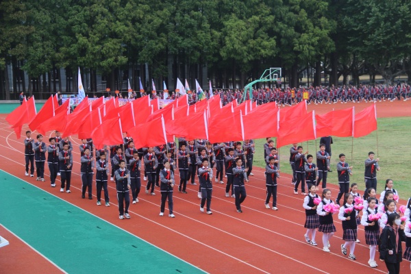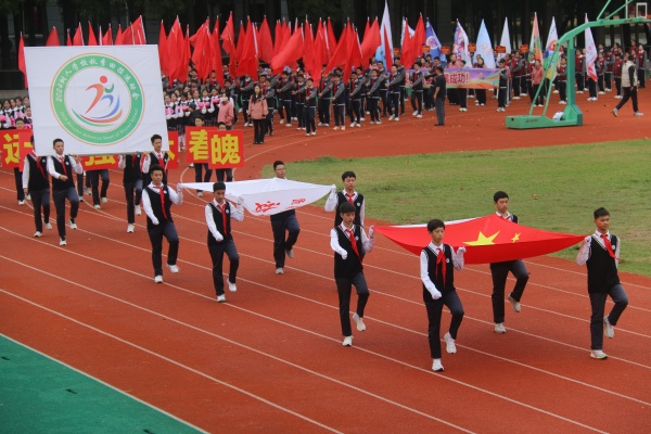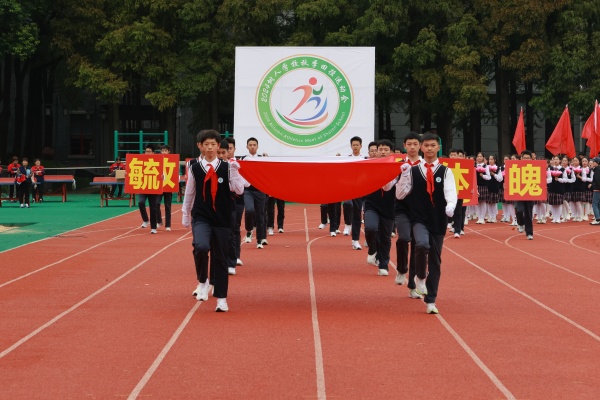 国旗队、校旗队、会徽、标语、鲜花队、红旗队入场