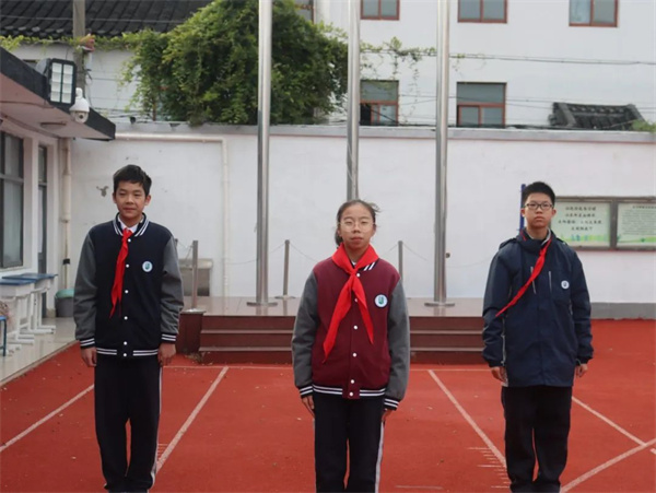 本周升旗仪式由初一(15)班主要负责,主持人是贾陈昀同学,升旗手是吴紫彤同学,护旗手是杨源飞和杨泽轩同学。升旗仪式正式开始,初一(15)班国旗护卫队三位同学迈着矫健的步伐,昂首阔步迈向升旗台。随着国歌声的响起,五星红旗冉冉升空在朝晖中迎风飘扬。