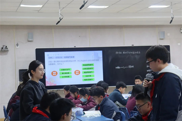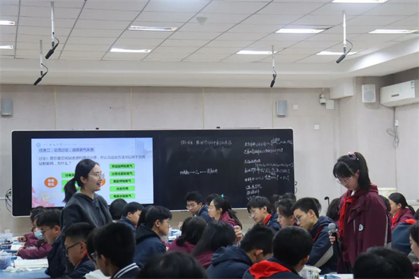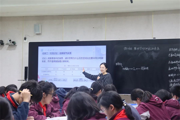 第一节课是由南京金陵中学袁梦玥老师开展的微项目教学“探秘空间站中氧气的来源”,本节课从能量转化,定量关系以及资源利用等方面开展,复习回顾了工业上制氧、实验室制氧、生活和农业上制氧的不同方法和原理,注重知识的宽度,思维的广度、情感态度和价值观的深度,探讨了不同领域的氧气的制备,落实核心素养,引领学生体会元素守恒和变化观念。课堂上袁老师教态自然,语言生动,氛围活跃。课堂设计充分体现新课标的教学理念,展示了较好的教学基本功和较强的课堂驾驭能力,展现了青年教师蓬勃向上、勇于进取的风采。