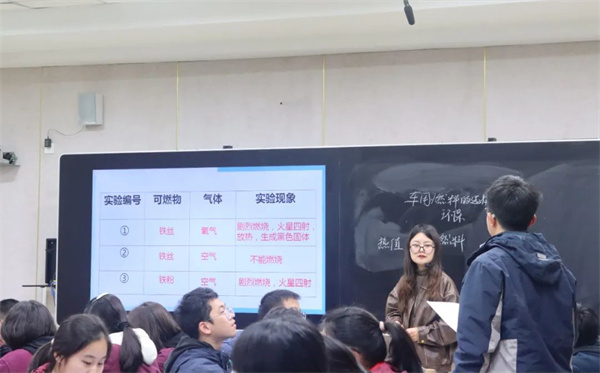 第二节课由我校张晨老师开展,以“汽车燃料的选择”为课题,上课时配合资料,整个教学环节完整、流畅,同时结合生活实例,让化学知识生活化,帮助学生建立起化学学习与生活之间的联系。张老师从能量变化导入本节课的学习,在化学课堂中向学生介绍了“西气东输”的天然气管道,充分调动了学生的积极性,以学生为中心,符合新课改的要求,张老师教学设计层次分明,环环相扣,重难点突出,充分展示了她的基本功。在整个课堂中渗透着探究的氛围。整节课以汽车燃料的选择为主线,体现了化学知识源于科学事实,将物质的燃烧讲解透彻,体现出化学学习对于理解生命活动的重要性。张老师对于问题的设计非常用心,从不同燃料的热值,到燃料的环保,由浅入深层层递进,注重学生思维的培养及训练,学生跟着张老师的思路,能更好地加深印象。张老师用幽默风趣的语言,化难为易,让学生有趣自主探究。