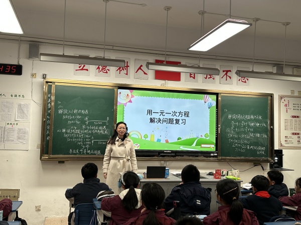 曹莉莉老师于下午第二节课在初一(3)班开设了一节《用一元一次方程解决问题复习》的复习课。曹老师通过精心设计的多样化的例题,让学生全面回顾了所学内容,使学生将实际问题转化为数学模型的技巧得到有效提升。曹老师在课堂上大胆放手让学生讲解,不仅帮助学生巩固已学知识,还能培养他们独立解决问题的能力。在教学过程中曹老师提供必要的指导与指示,鼓励学生自主探索和解决问题。本节课曹老师不仅全面覆盖了一元一次方程解决问题中的各种类型的题目,还注重巧妙的变式训练,通过对同一问题设置不同条件,引导学生从不同角度思考,培养了学生思维的灵活性。