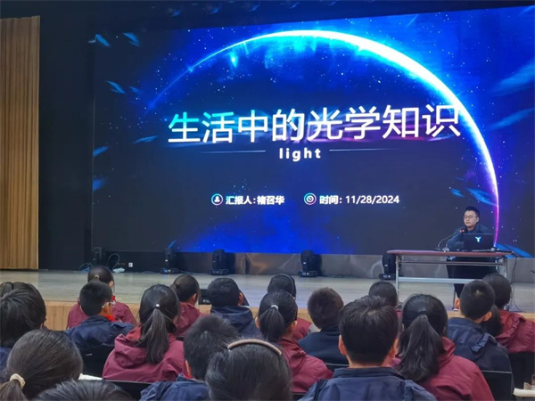 讲座伊始,主讲嘉宾褚先生深入阐述了光学的基本原理。他从光的本质出发,详细解释了光的波动性和粒子性,引用了历史上著名的双缝干涉实验和光电效应等经典案例,让学生对光的双重性质有了更清晰的理解。接着,褚先生分享了光学在新兴科技领域的前沿研究成果,同时介绍了新型光学材料的研发,这些材料具有独特的光学性能,如高折射率、可调控的光学吸收等。