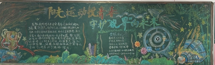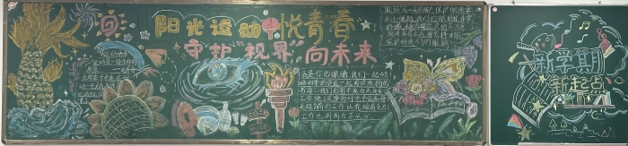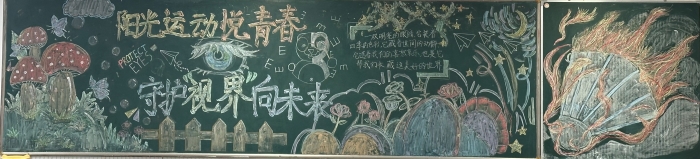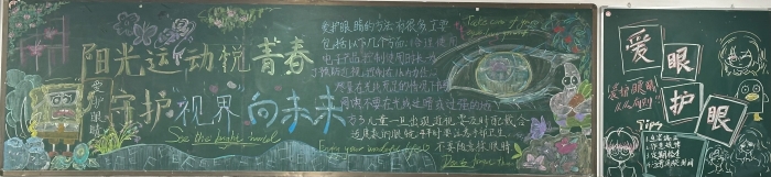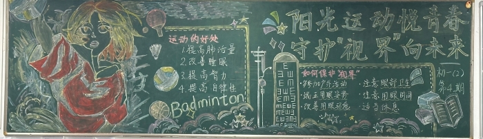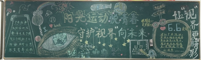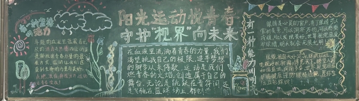 为提高学生对体育运动和视力保护重要性的认识,促进学生全面健康发展,南门街校区初一年级以“阳光运动悦青春,守护‘视界’向未来”为主体,开展黑板报设计大赛。各班同学充分发挥创意和团队协作精神,围绕主题精心设计黑板报内容,有的通过绘制活力四射的运动健儿形象、展示各种体育项目的精彩瞬间,生动地传达了运动的快乐与价值。有的用形象的图表和简洁的文字,科普了近视形成的原因、预防方法和护眼小常识,