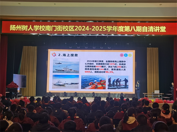 2024年12月5日下午,树人学校南门街校区艺术报告厅内座无虚席,2024-2025学年第八期“自清讲堂”——扬州海事水上安全知识进校园活动在此热烈展开。本次讲座旨在普及青少年水上安全知识,增强学生们的自救能力。